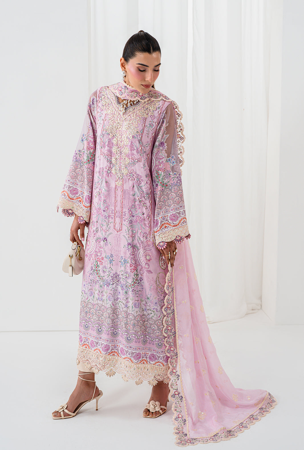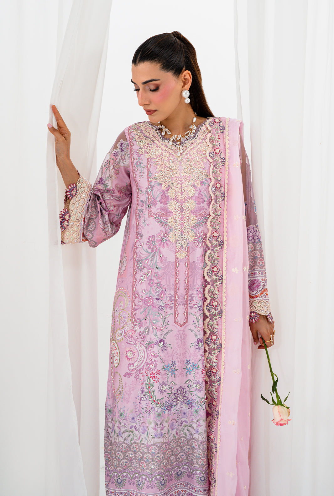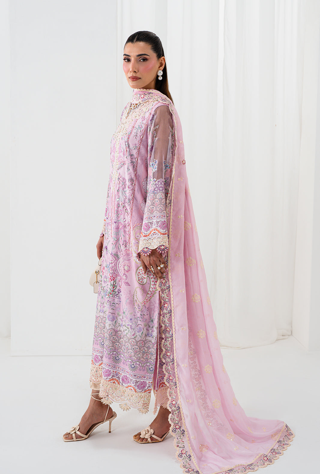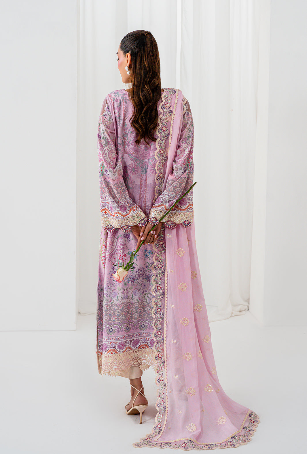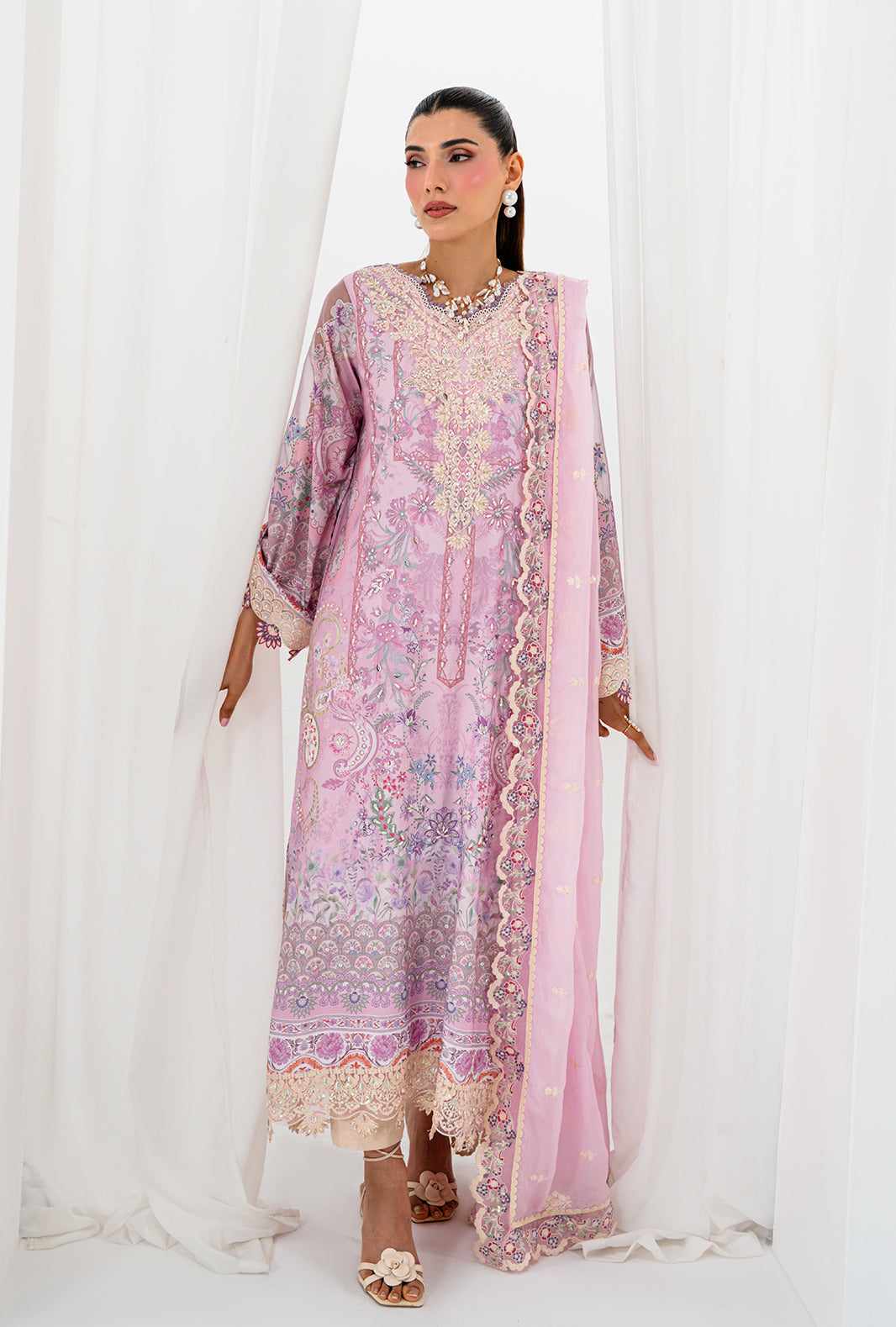 AELA is where craft becomes poetry — a rawsilk printed long shirt with a neckline of hand sewn lace and organza petals, placed with meticulous care. Scalloped embroidered and hand embellished borders trace the daman and sleeves, finishing every edge with AJR's signature precision. Straight capri raw silk pants ground the silhouette in clean elegance, completed by an embroidered silk dupatta finished with embroidered borders and lace details on all four sides.