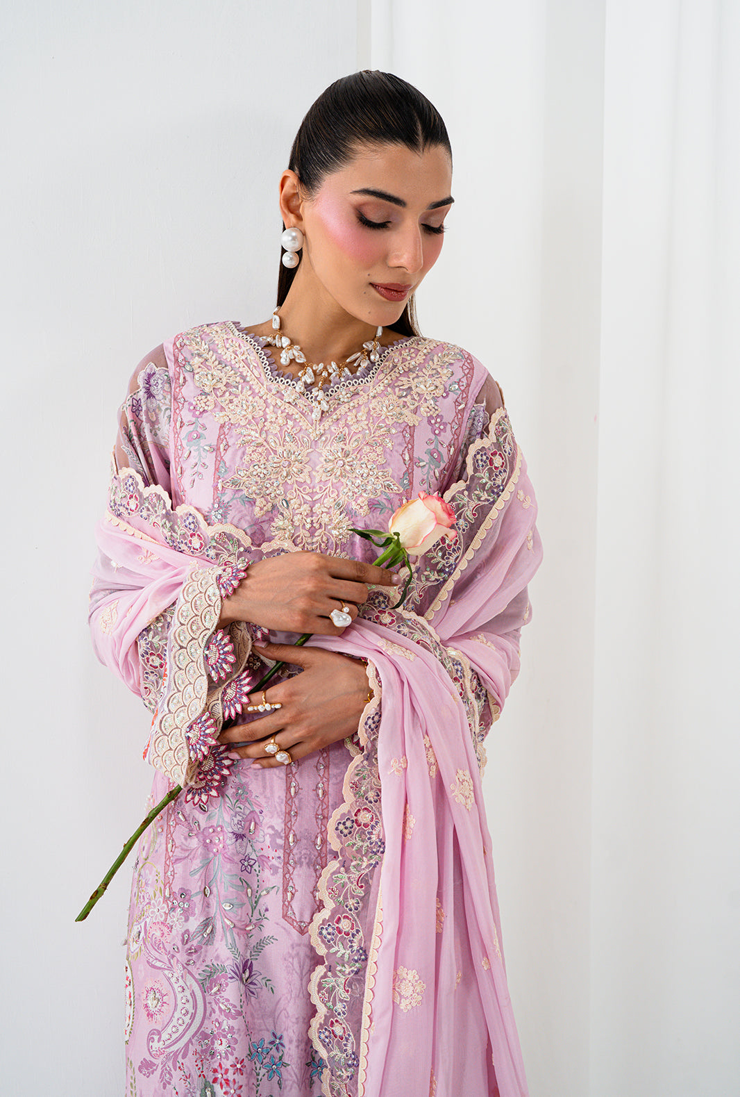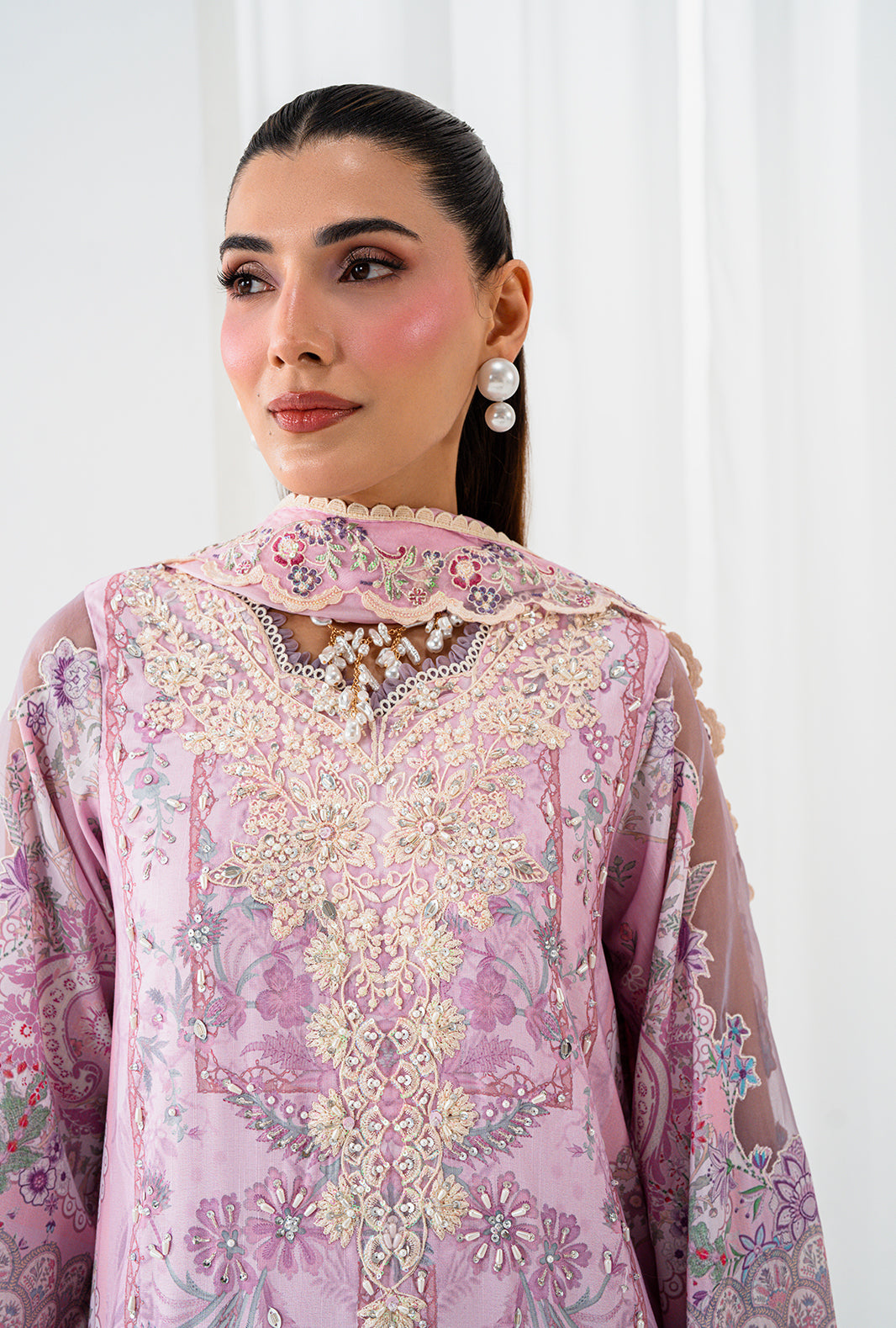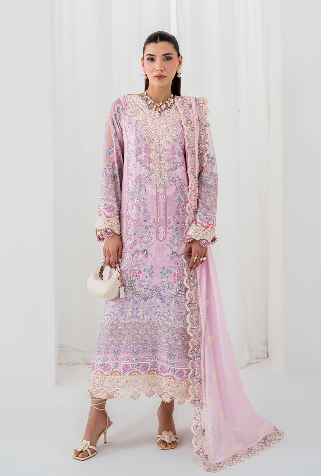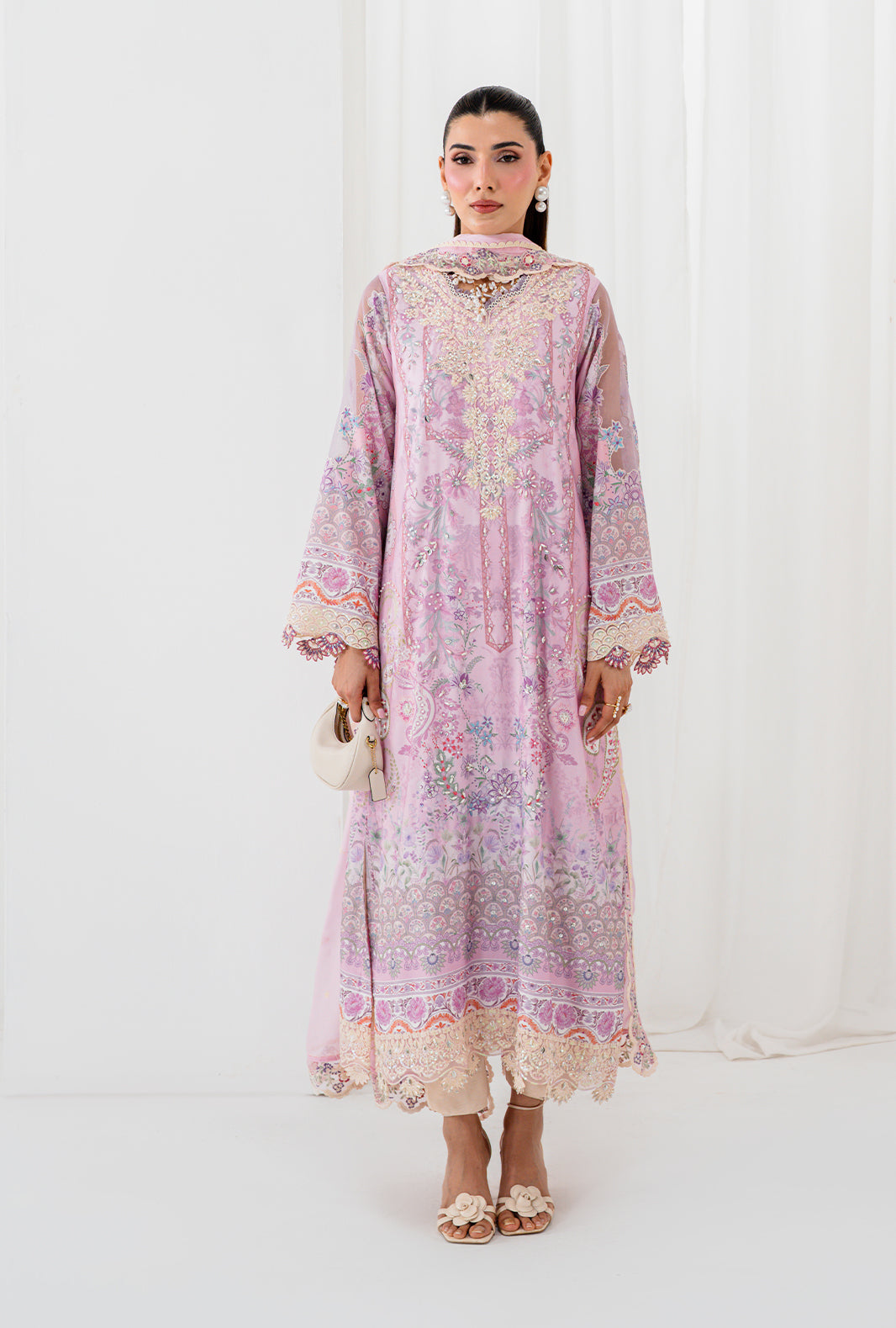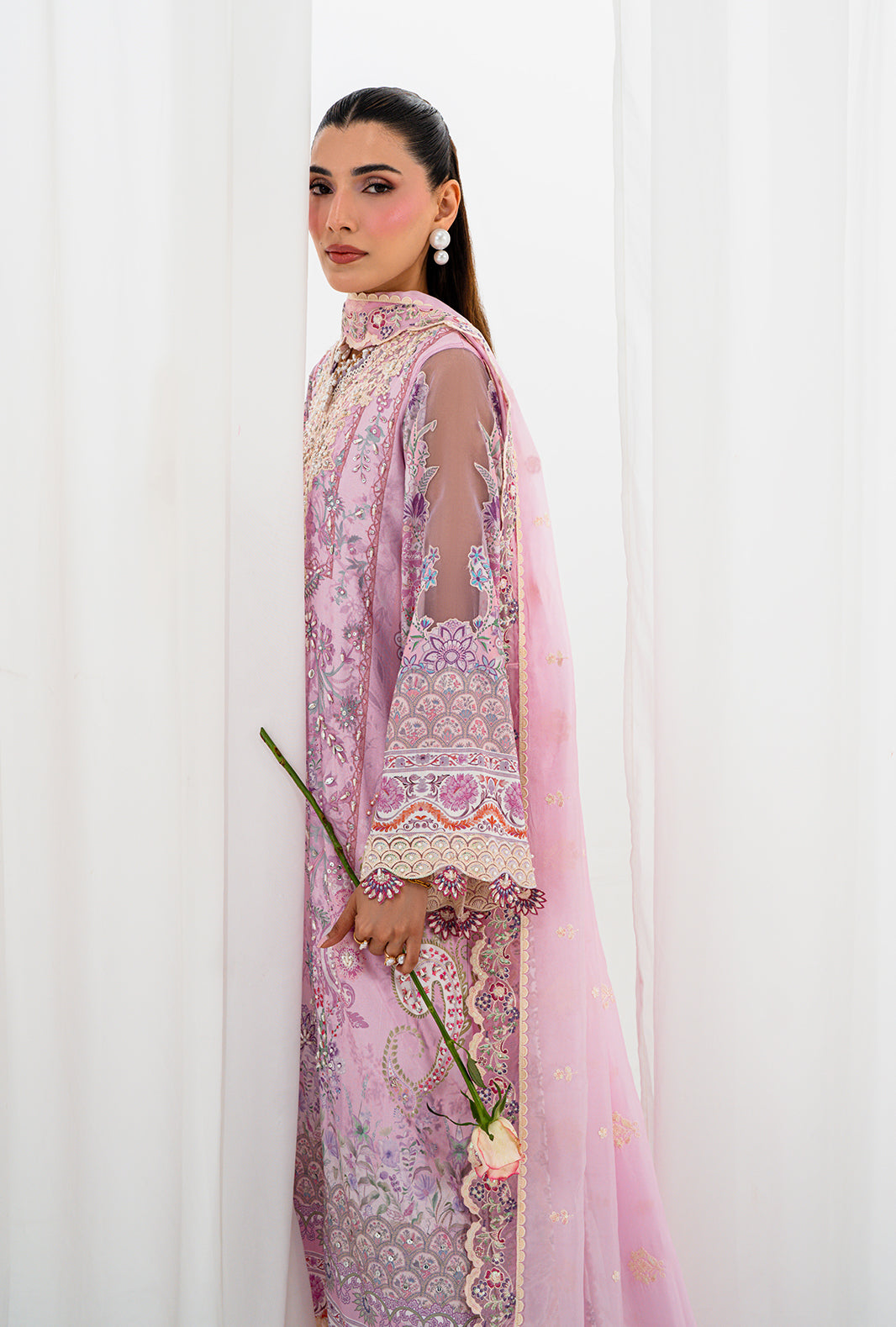 AELA is where craft becomes poetry — a rawsilk printed long shirt with a neckline of hand sewn lace and organza petals, placed with meticulous care. Scalloped embroidered and hand embellished borders trace the daman and sleeves, finishing every edge with AJR's signature precision. Straight capri raw silk pants ground the silhouette in clean elegance, completed by an embroidered silk dupatta finished with embroidered borders and lace details on all four sides.