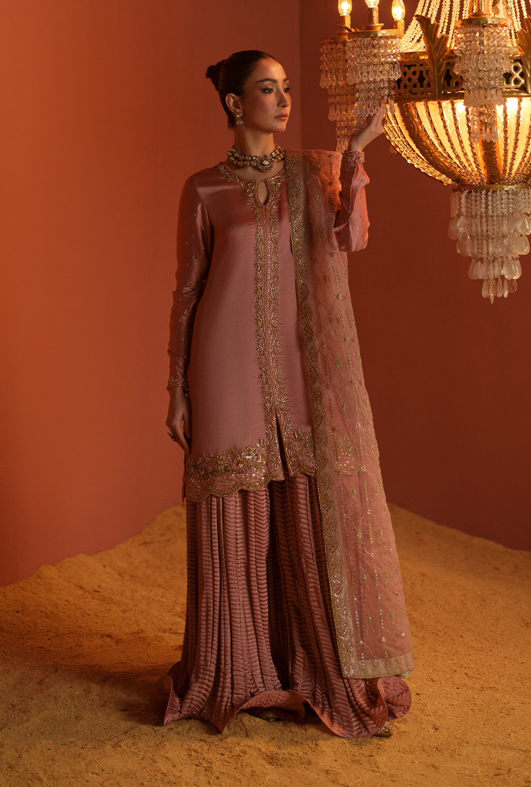 Paired with a flowing silk crushed sharara that adds soft volume and movement.