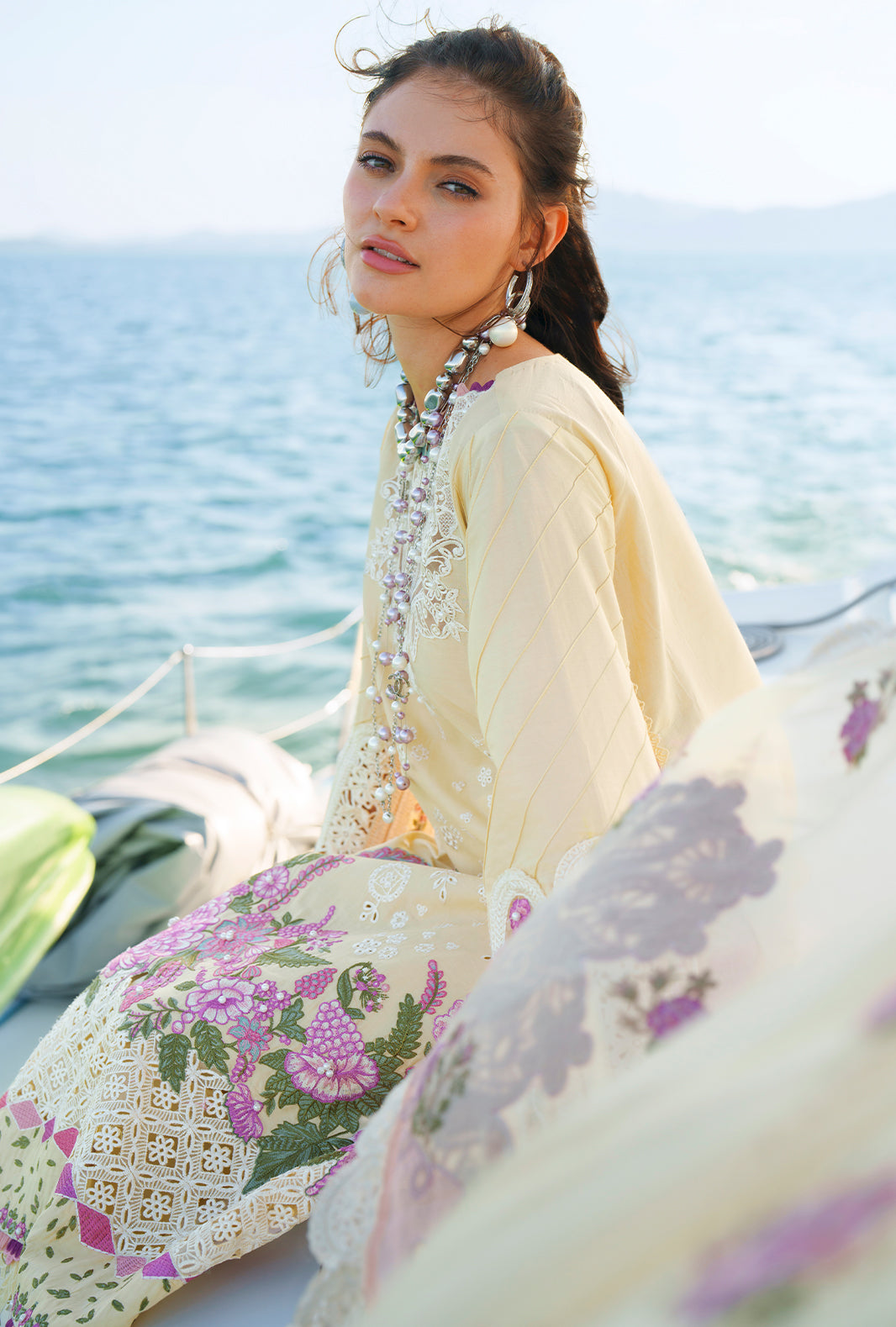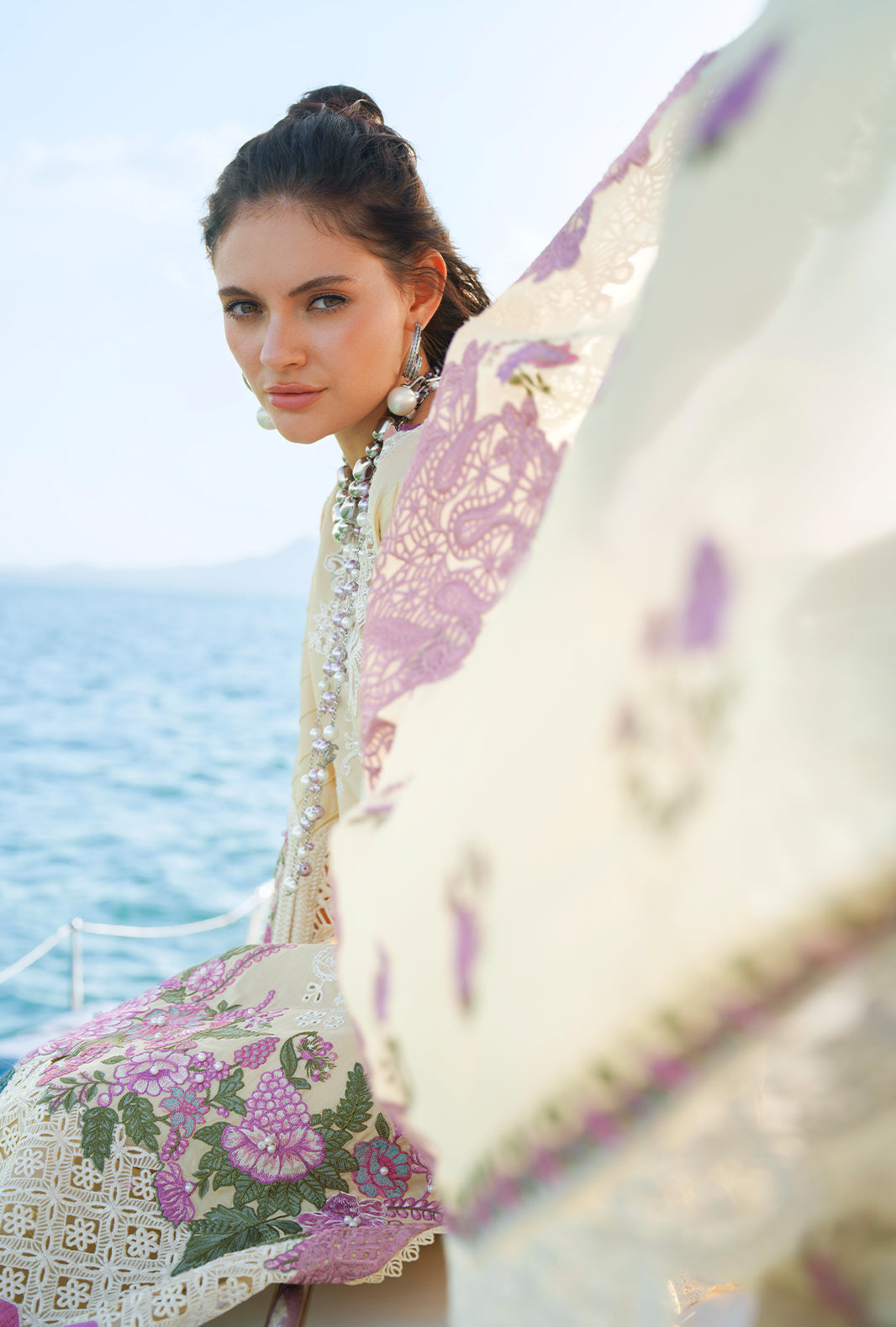 A beautifully detailed chikankari lawn ensemble featuring delicate organza on the neckline, borders, and side patti accents.
