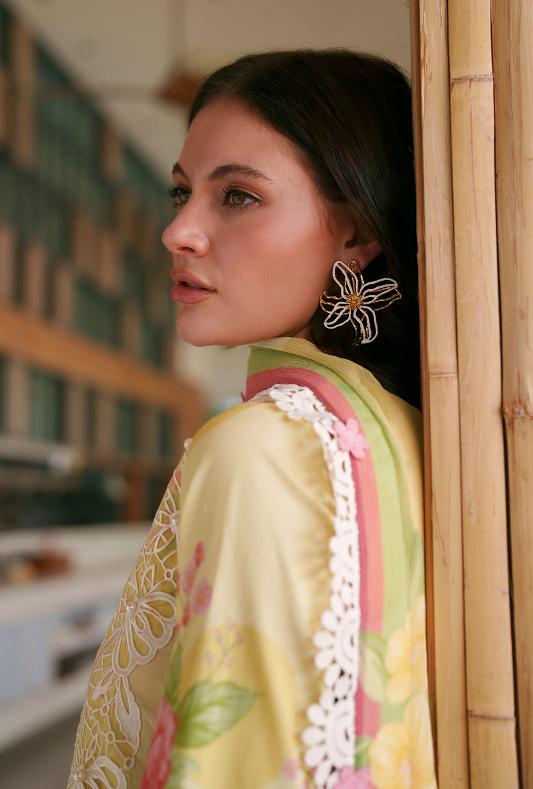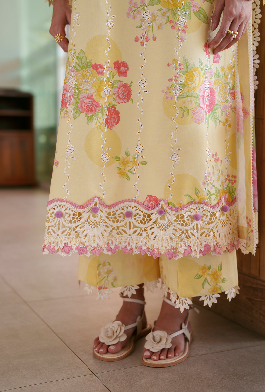 FEYA features a printed lawn shirt exquisitely adorned with Chikankari embroidery on the front, highlighted by an embroidered neckline and shirt front border for a sophisticated appeal. Delicate embroidered sleeve borders complement the printed lawn sleeves and back, creating a harmonious design. Paired with printed cotton trousers and a soft chiffon printed dupatta, this ensemble radiates timeless elegance and charm.