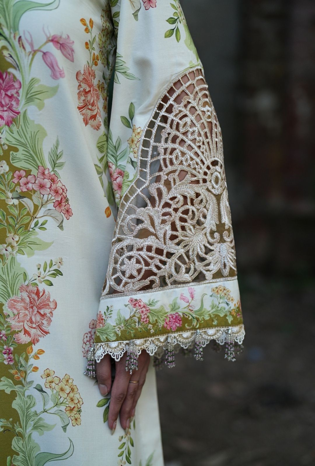 A digitally printed shirt paired with a matching printed trouser, designed to capture effortless sophistication in every thread. The look is elevated with an embroidered organza neckline patti, delicate sleeves border, and an intricately embroidered daman border — a true celebration of detail and artistry. Wrapped in a woolen printed shawl, Gulrukh blooms with elegance, warmth, and timeless allure.