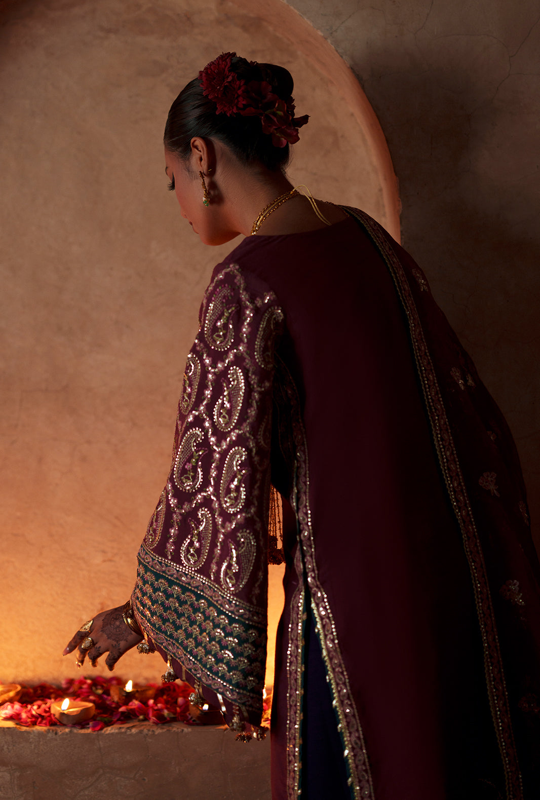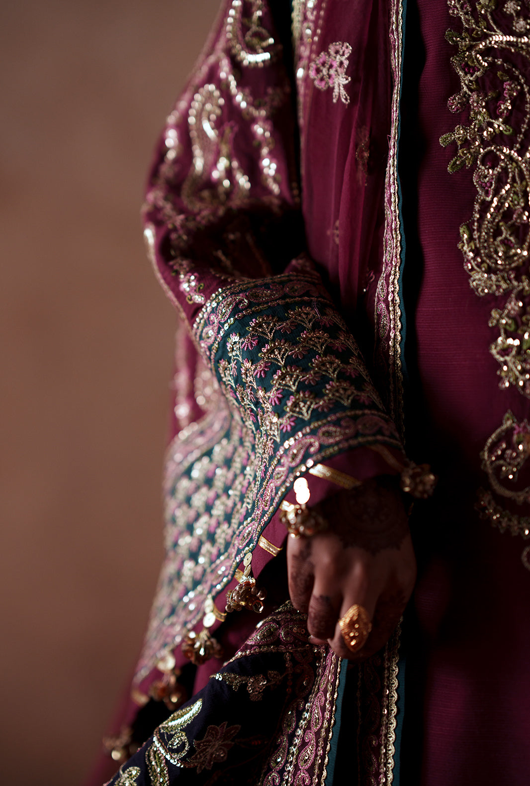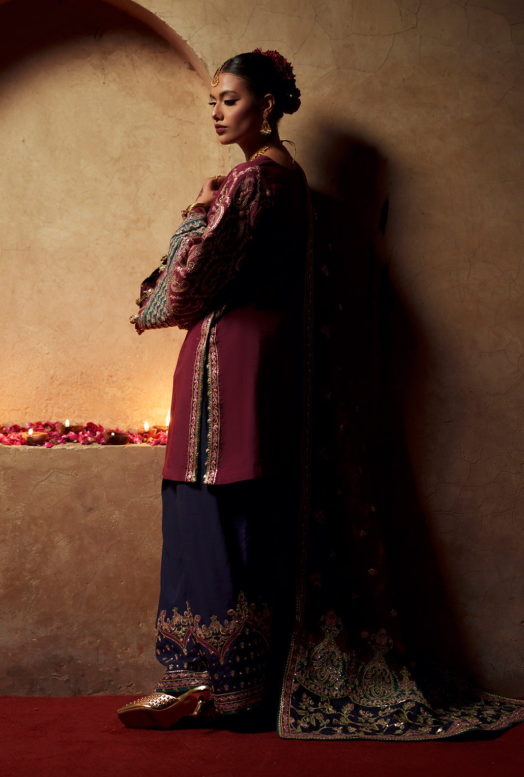 Statement embroidered neckline on dyed rawsilk, side pattis, and intricately detailed sleeves with floral jall and paisley motifs. Indigo rawsilk shalwar echoes elegance with embroidered borders, while the organza dupatta with indigo and teal pallus, and embroidered four-sided trims, completes a look of refined artistry and festive grace.