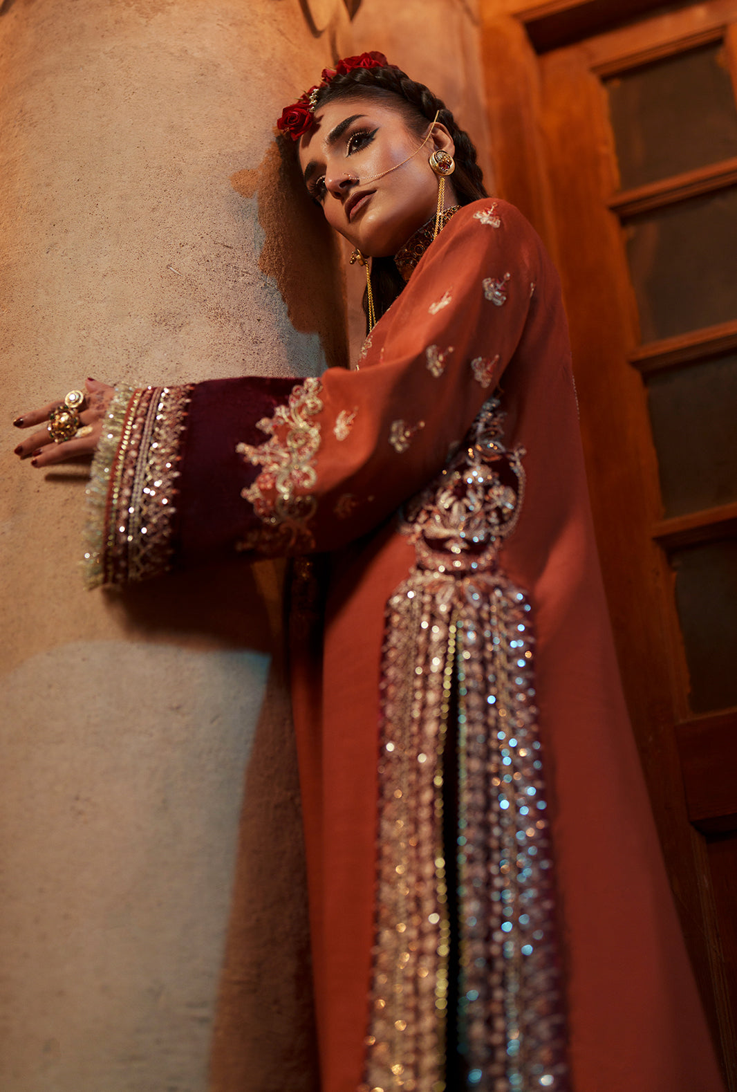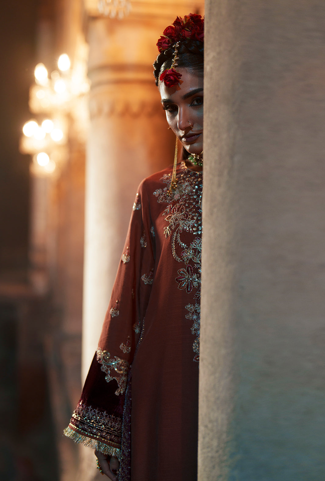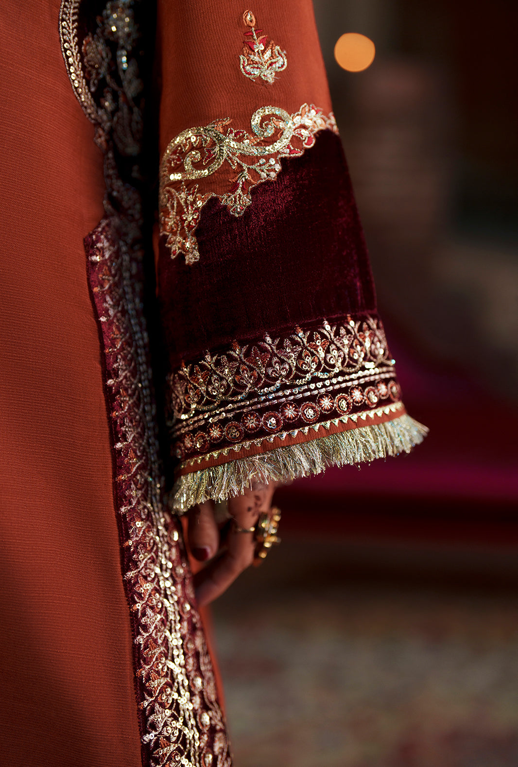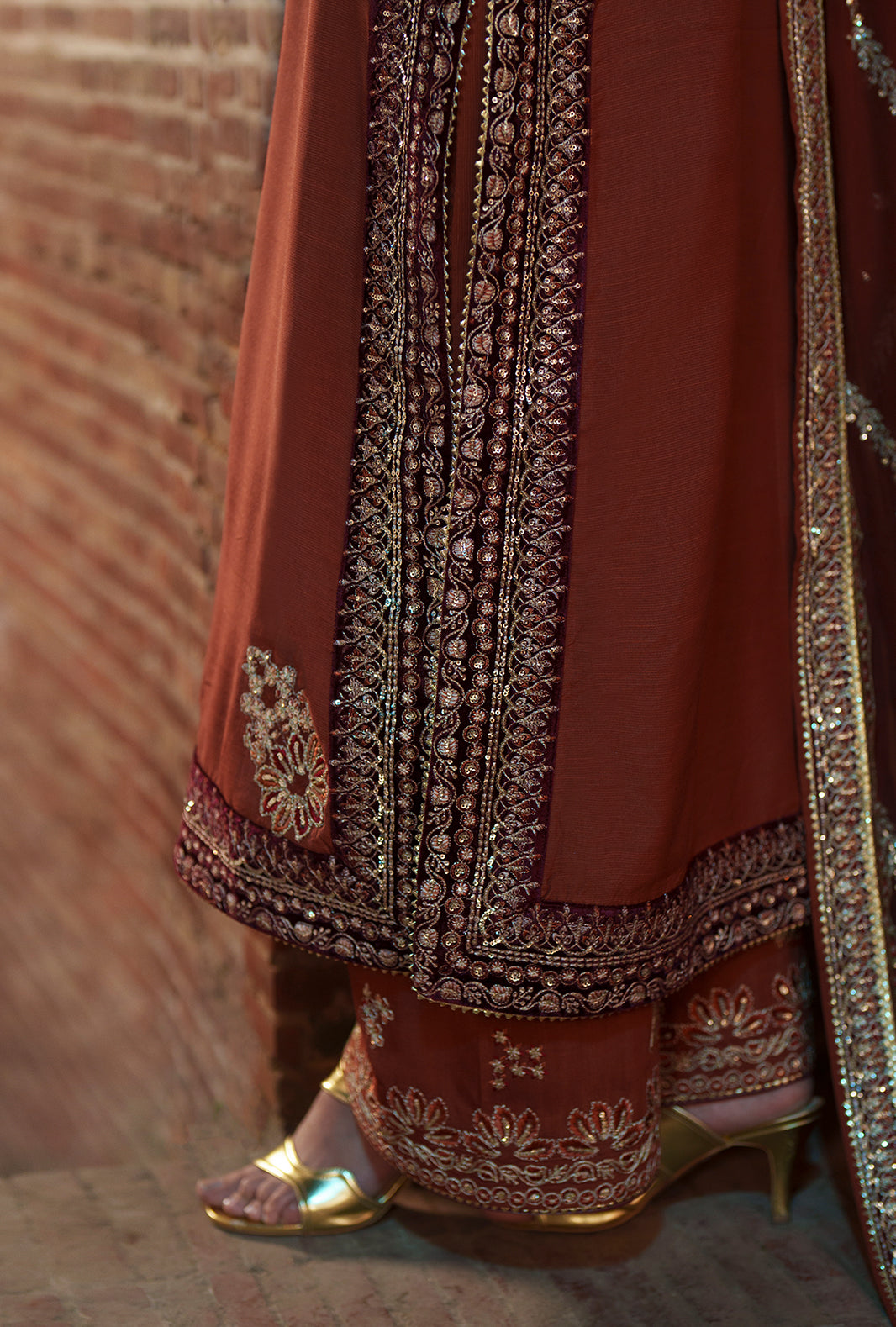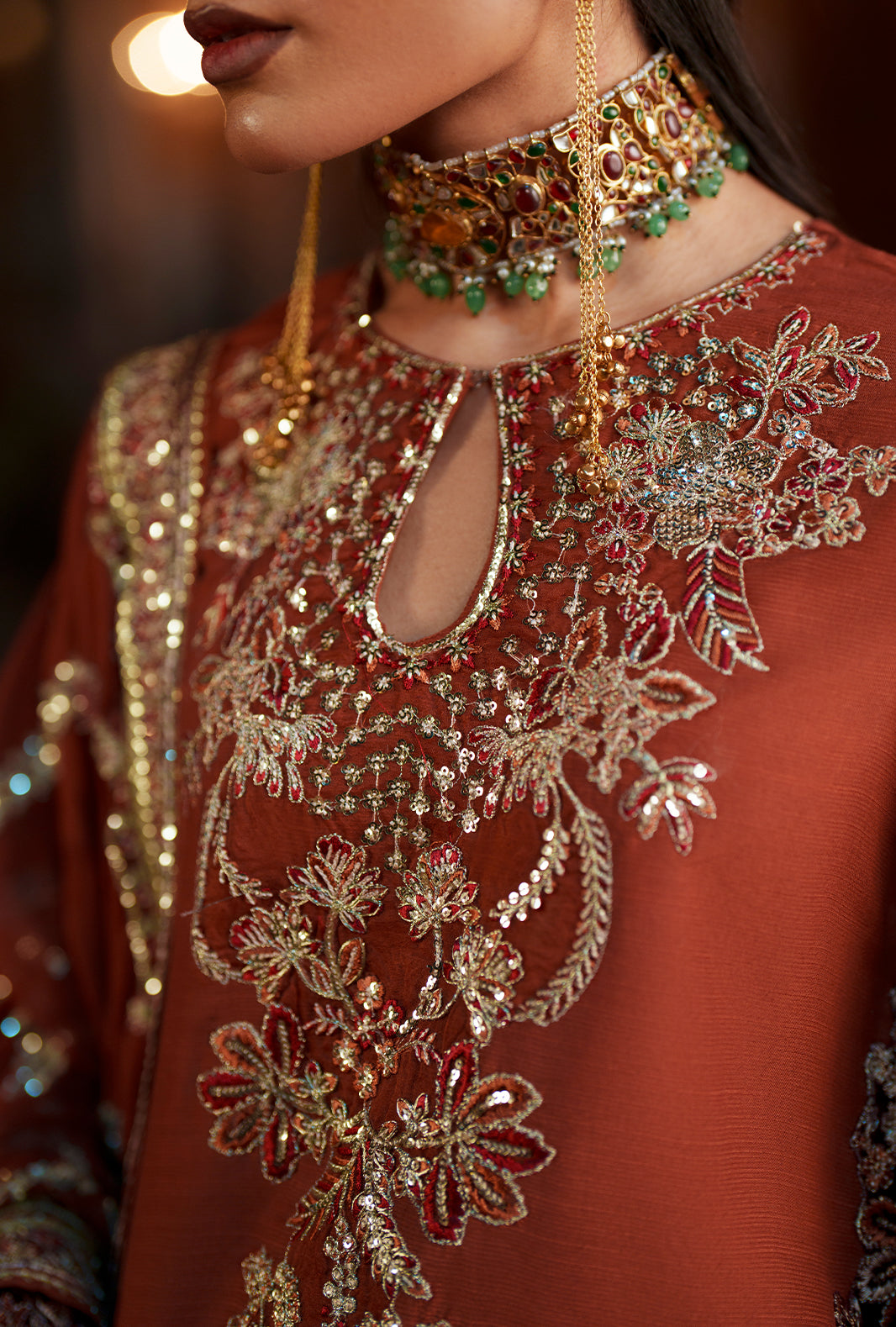 Embroidered keyhole neckline, daman motifs, and velvet-bordered side slits bring bold elegance to the rawsilk kameez. Sleeves and trousers mirror the richness with composed embroidery and chan work, while a chiffon dupatta, finished with a four-sided embroidered border, completes a look made to move gracefully and linger beautifully.