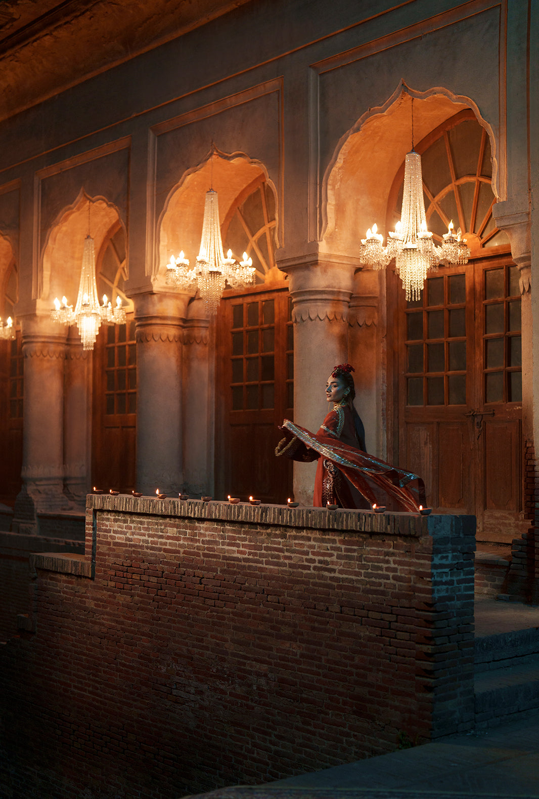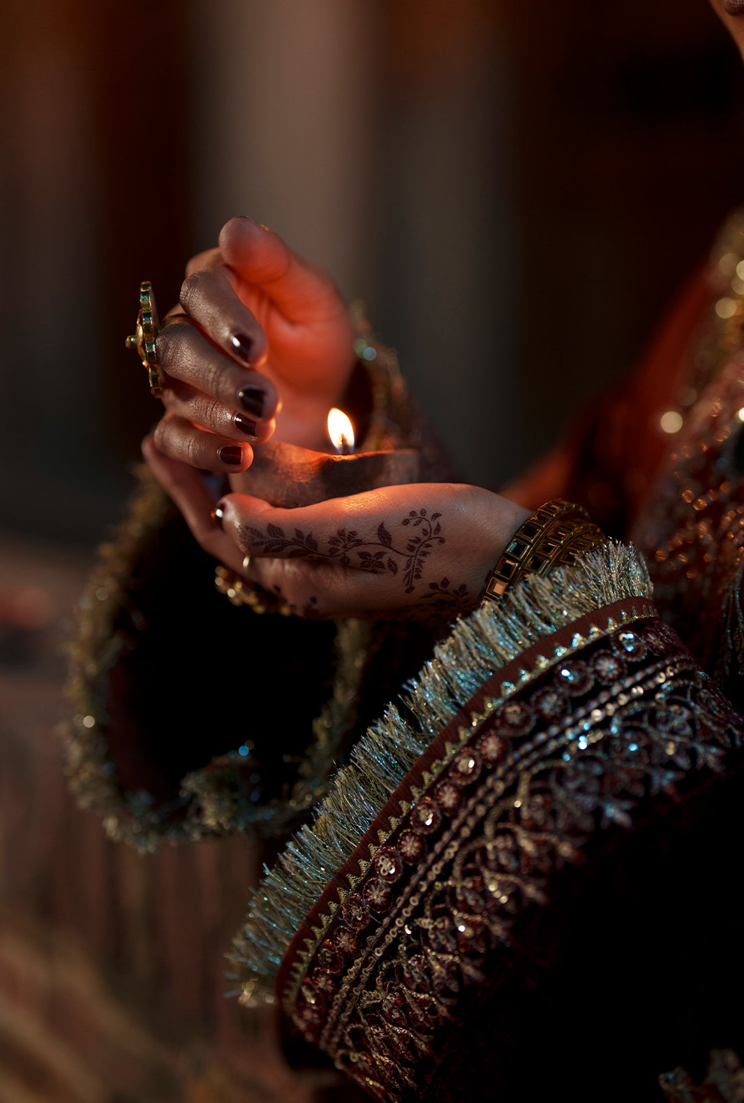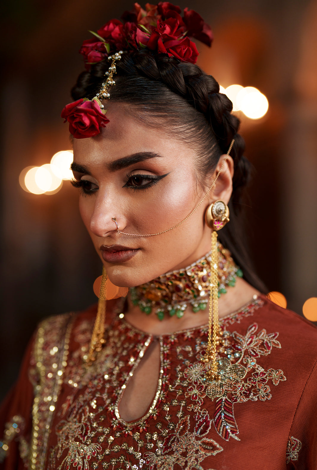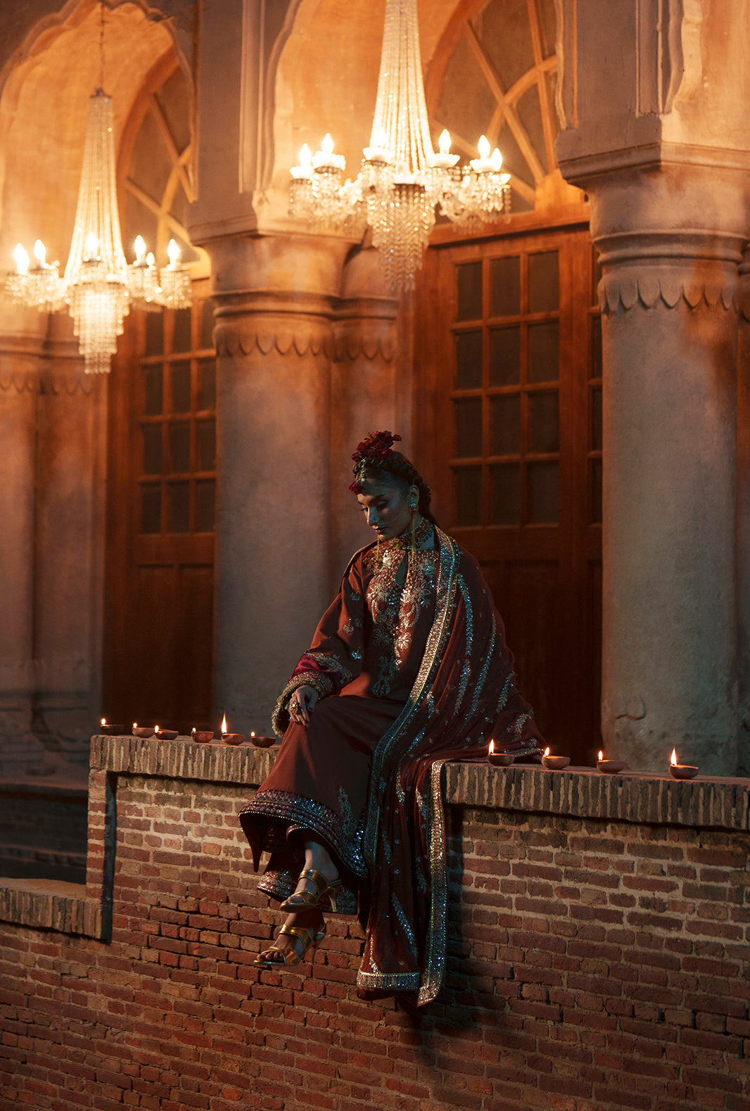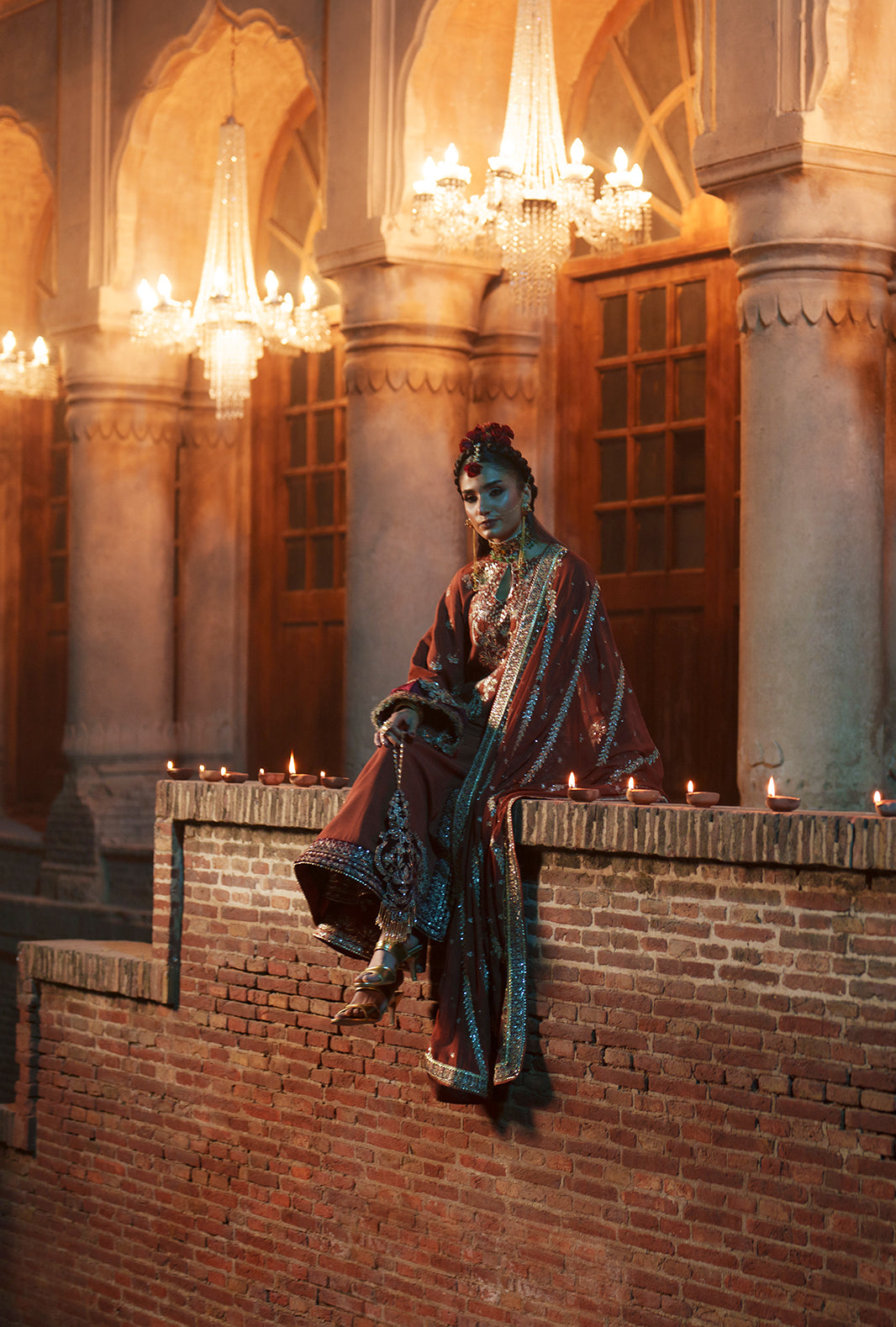 Embroidered keyhole neckline, daman motifs, and velvet-bordered side slits bring bold elegance to the rawsilk kameez. Sleeves and trousers mirror the richness with composed embroidery and chan work, while a chiffon dupatta, finished with a four-sided embroidered border, completes a look made to move gracefully and linger beautifully.
