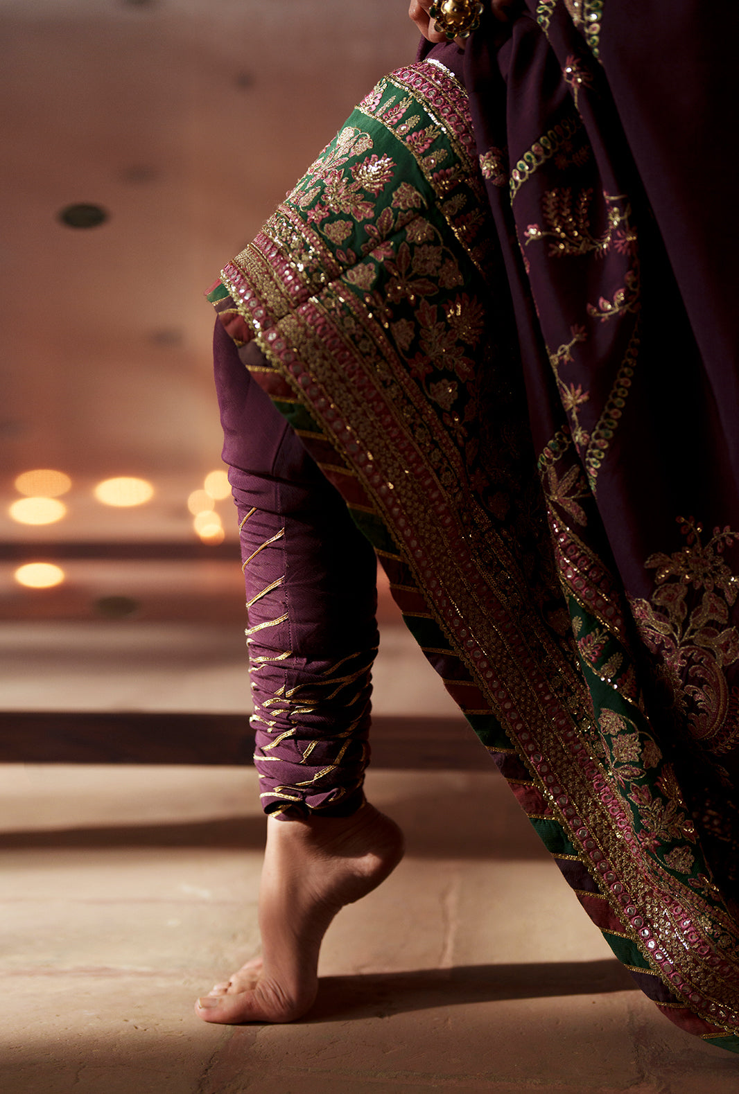 Dark plum rawsilk kalidar with embroidered yoke, bold center daman motif, floral side panels, and delicate sprays. Three contrasting borders frame the hem, while chatta-patti sleeves add finesse. Dyed churidar trousers and an organza dupatta with green pallu borders complete a look of timeless sophistication and graceful movement.