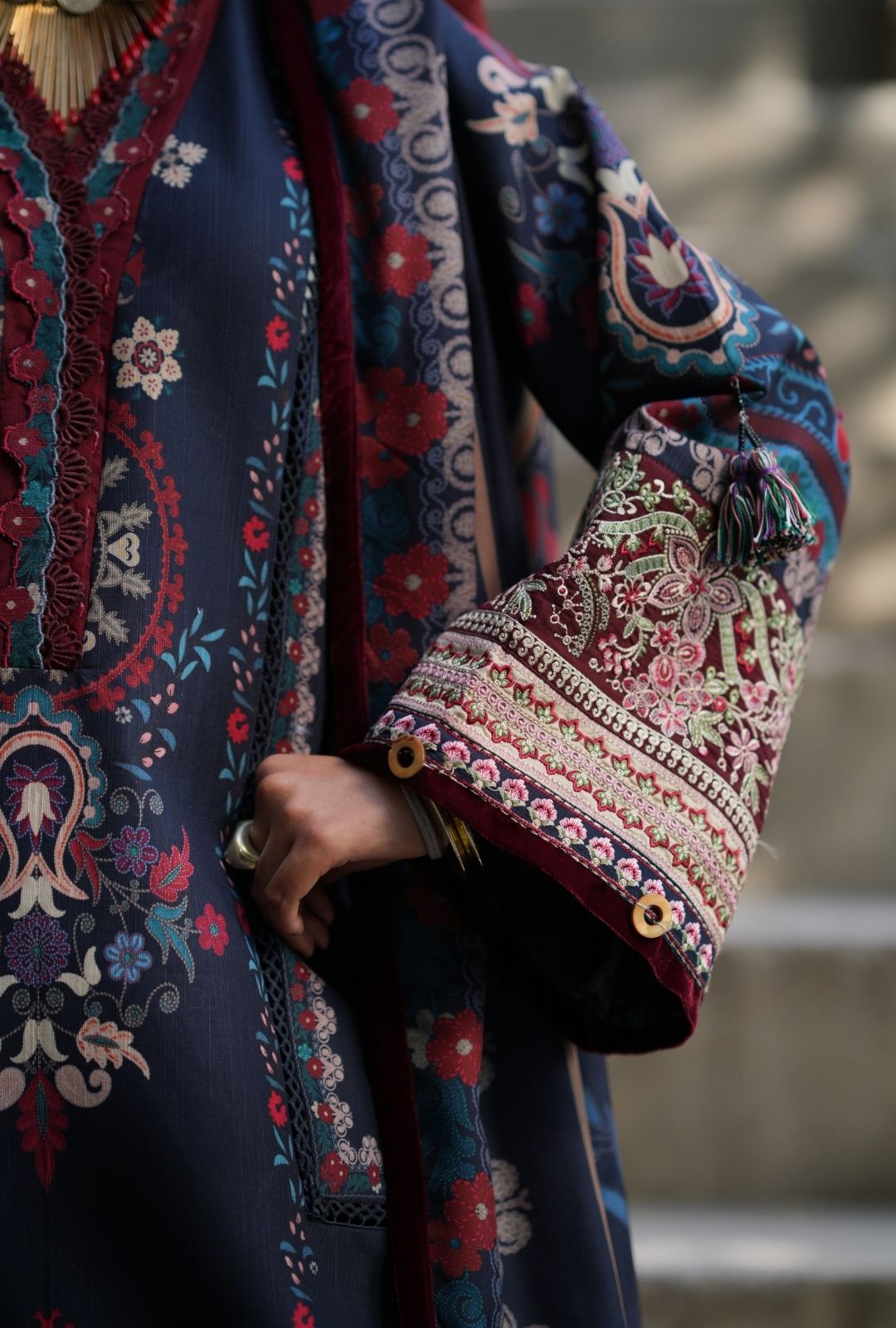 A digitally printed khaddar shirt paired with a matching printed khaddar trouser, brought to life in soft textures and timeless hues. The artistry unfolds through embroidered silk sleeve borders — 1, 2, and 3 — each telling its own story of craftsmanship and detail. An embroidered silk daman border adds the final touch of sophistication, while the herringbone printed shawl drapes the look in effortless elegance. Nilofer — where tradition meets refined modernity.