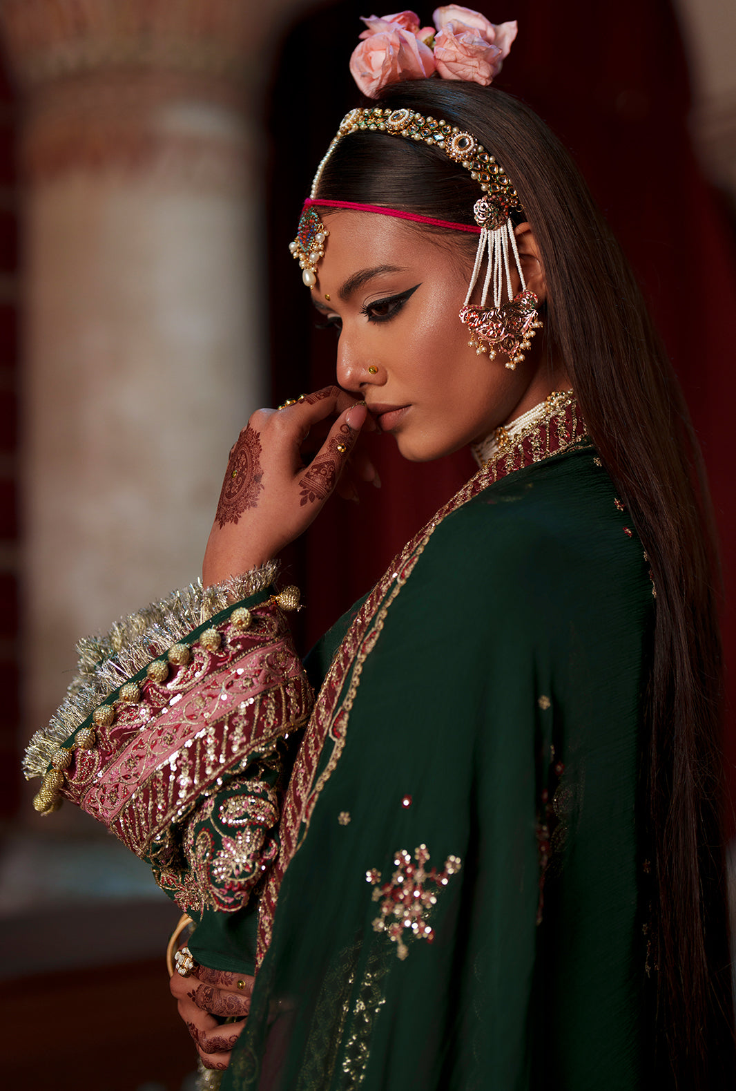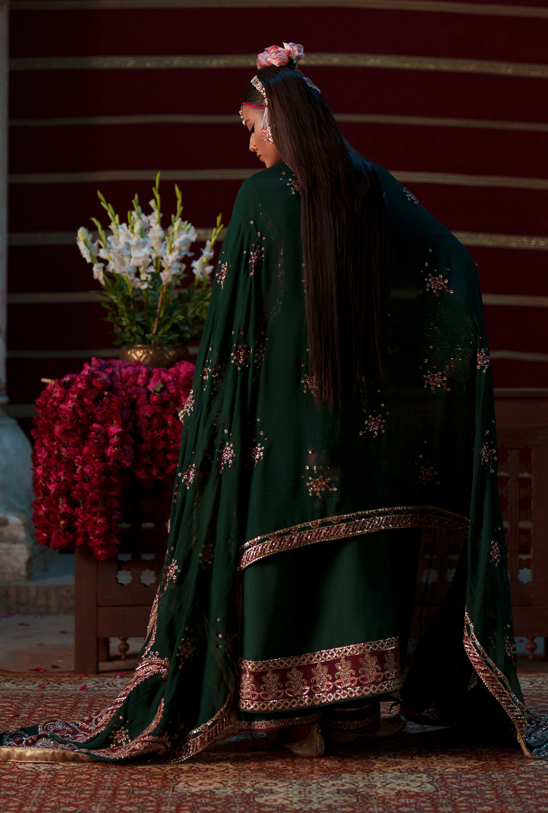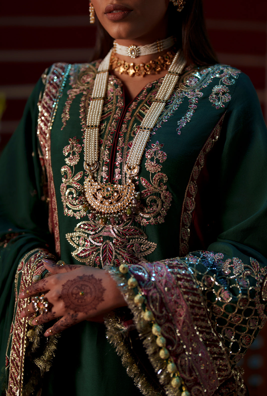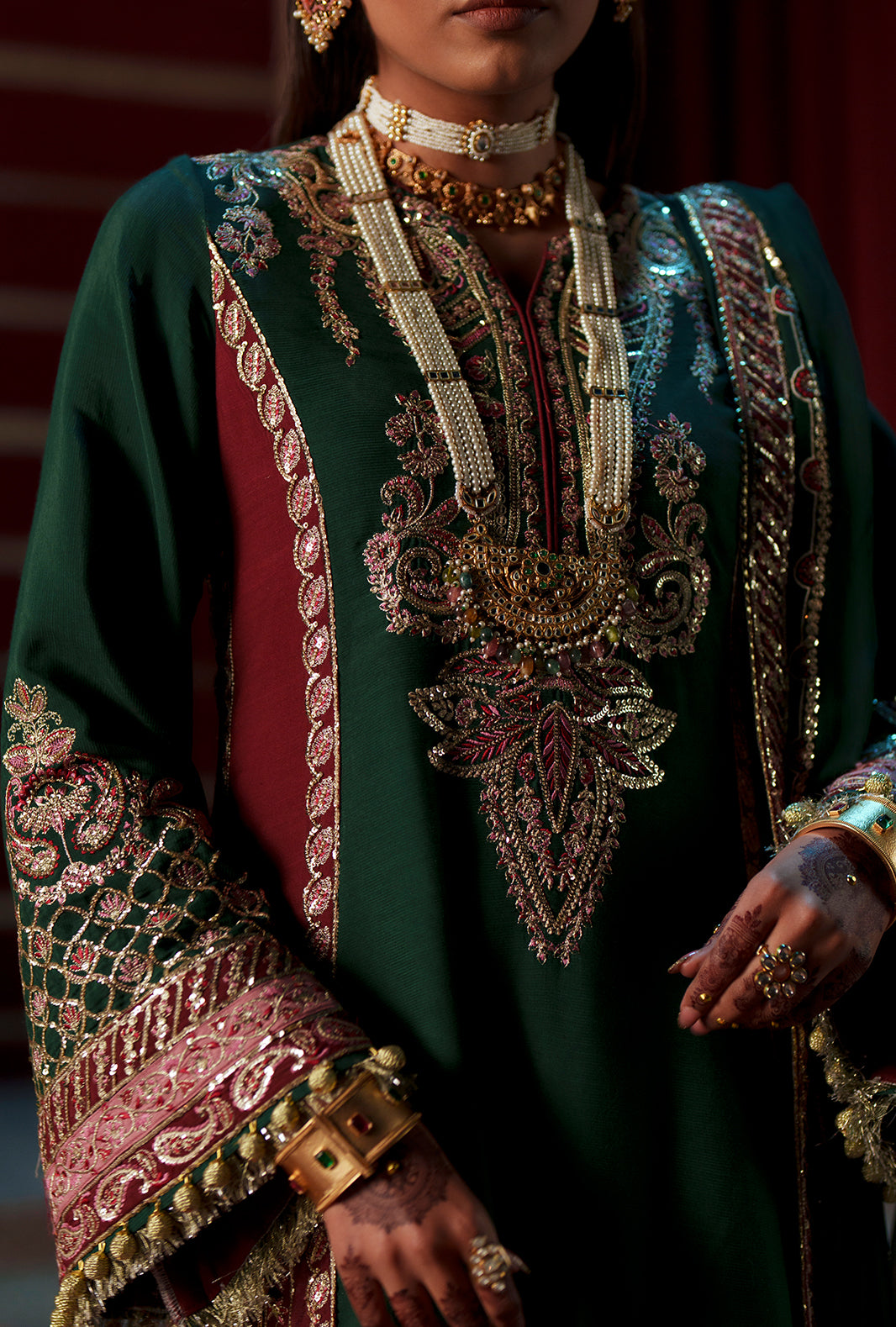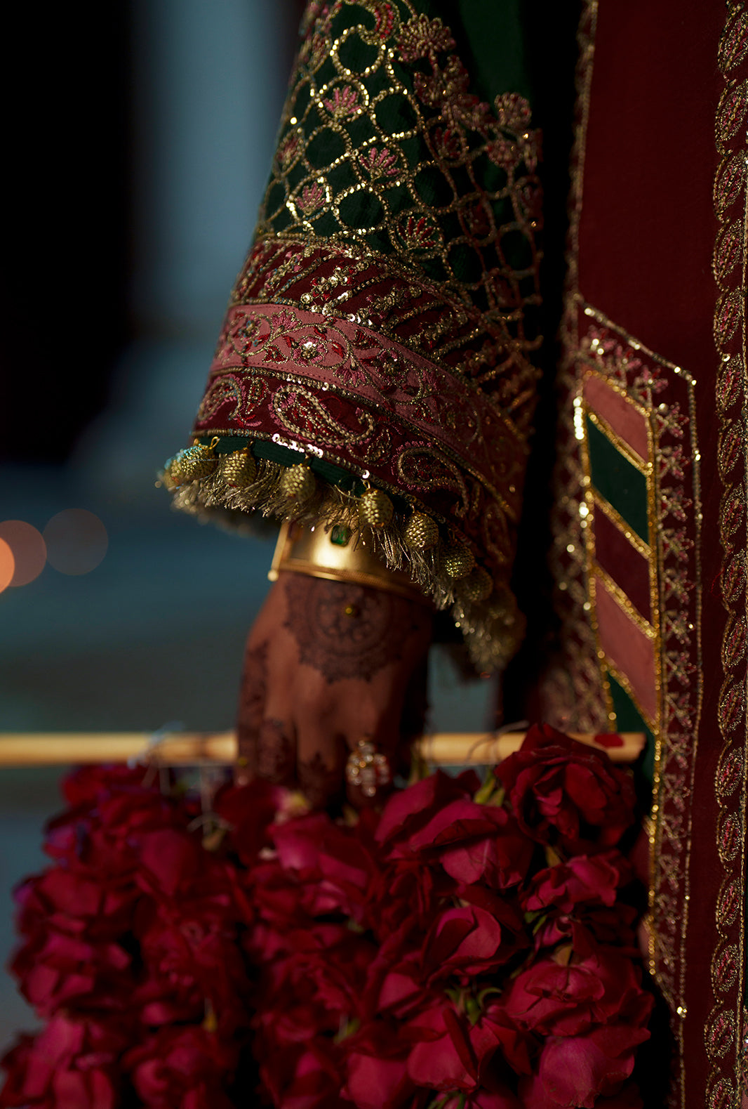 Embroidered neckline, layered borders, and contrasting side panels in deep maroon and pink, paired with a dyed trouser and chiffon dupatta adorned with paisley pallu. Every detail tells a story of timeless elegance and flowing grace.