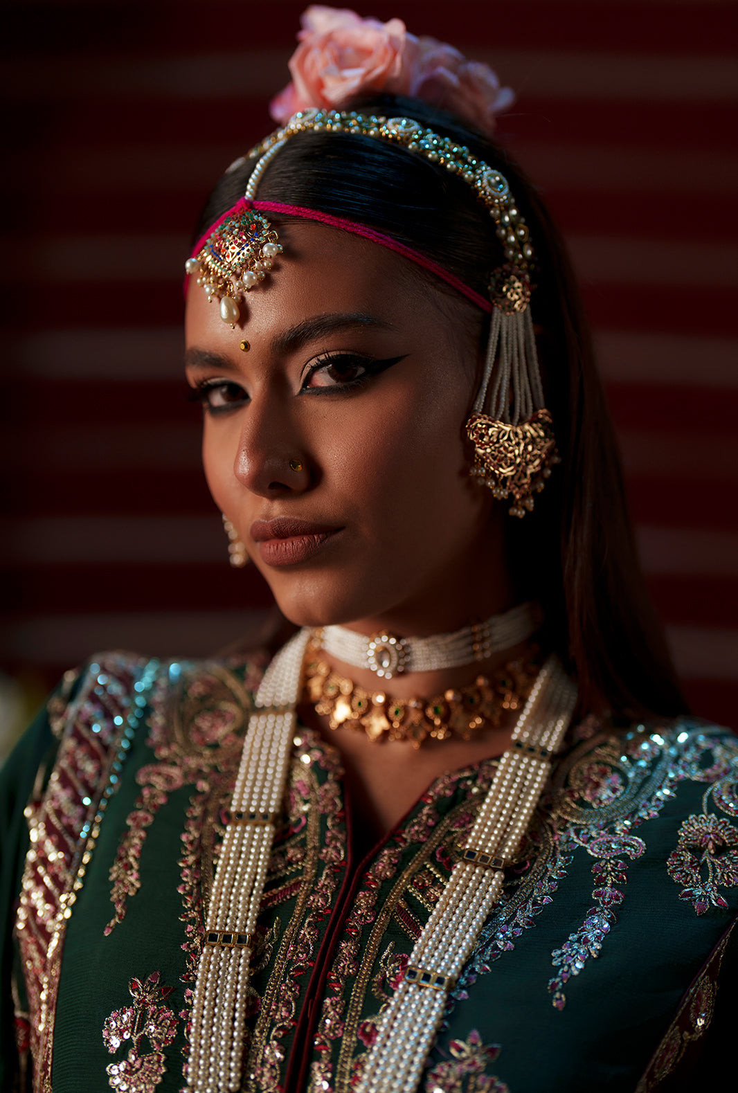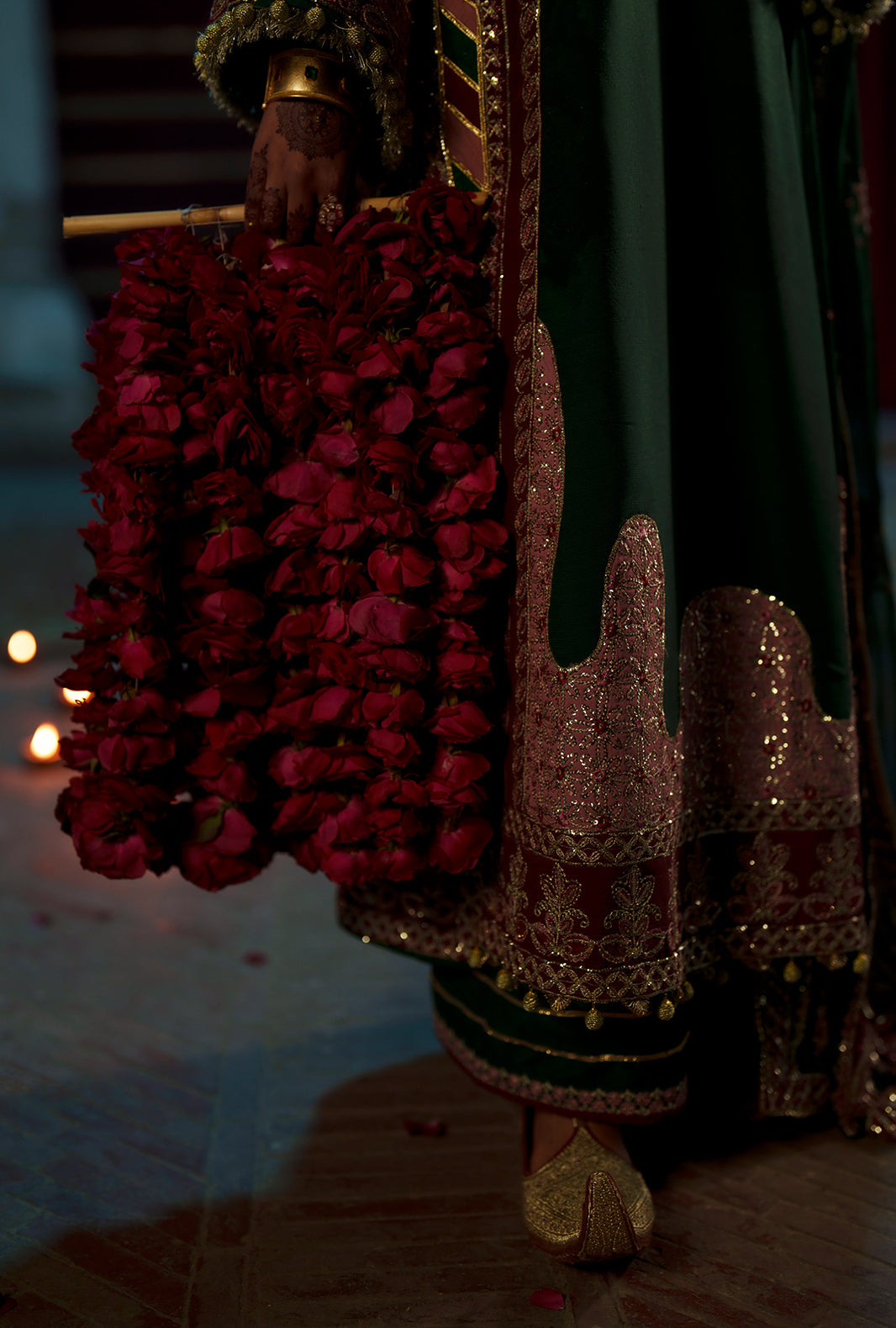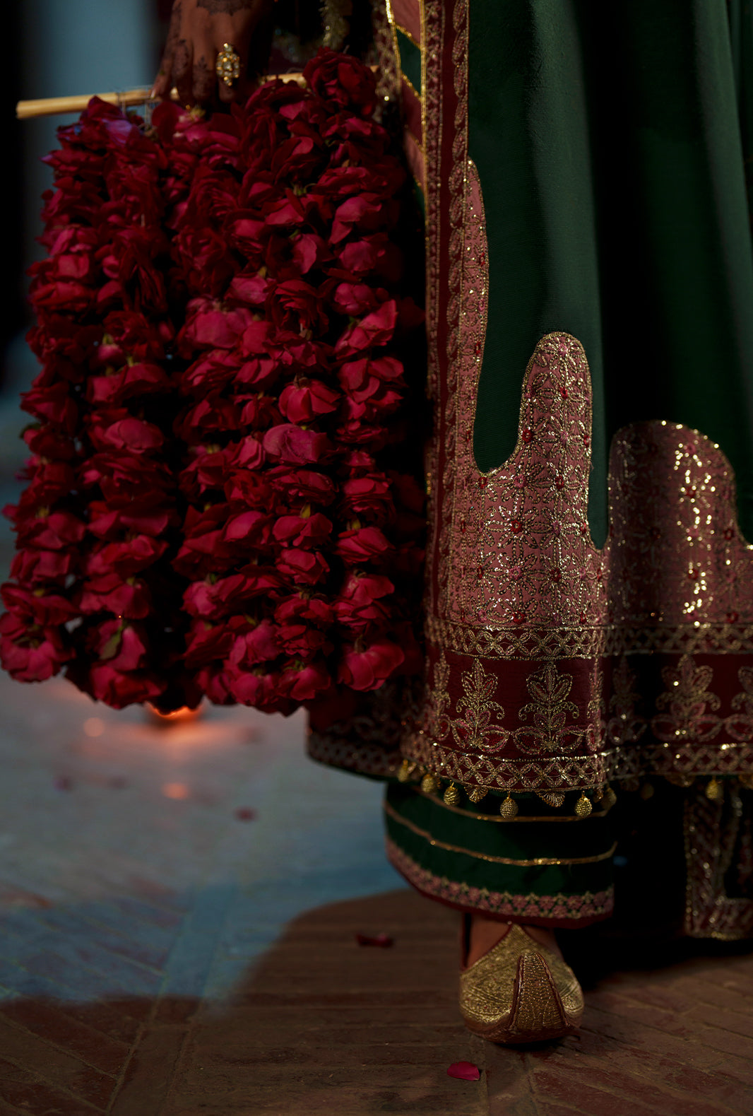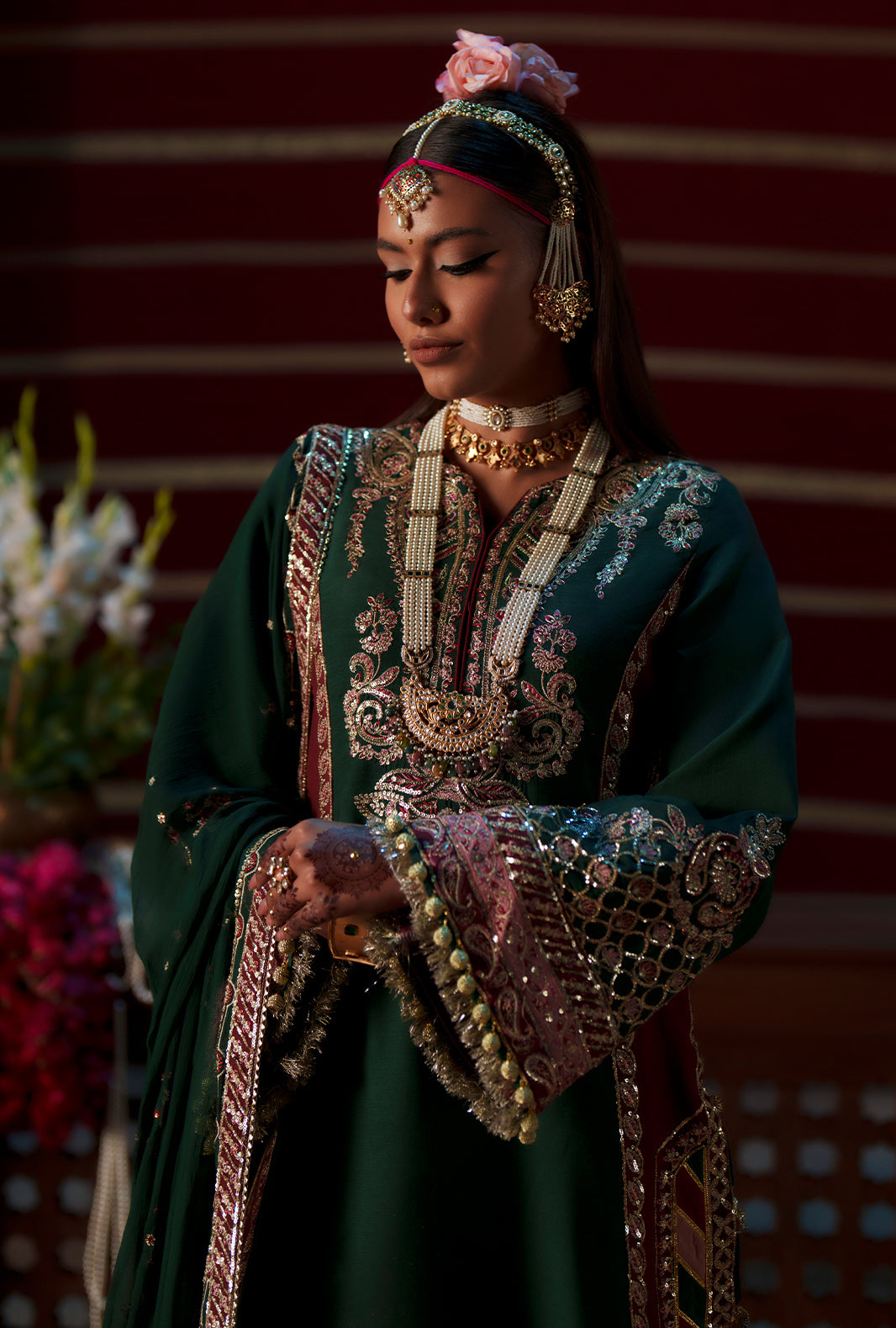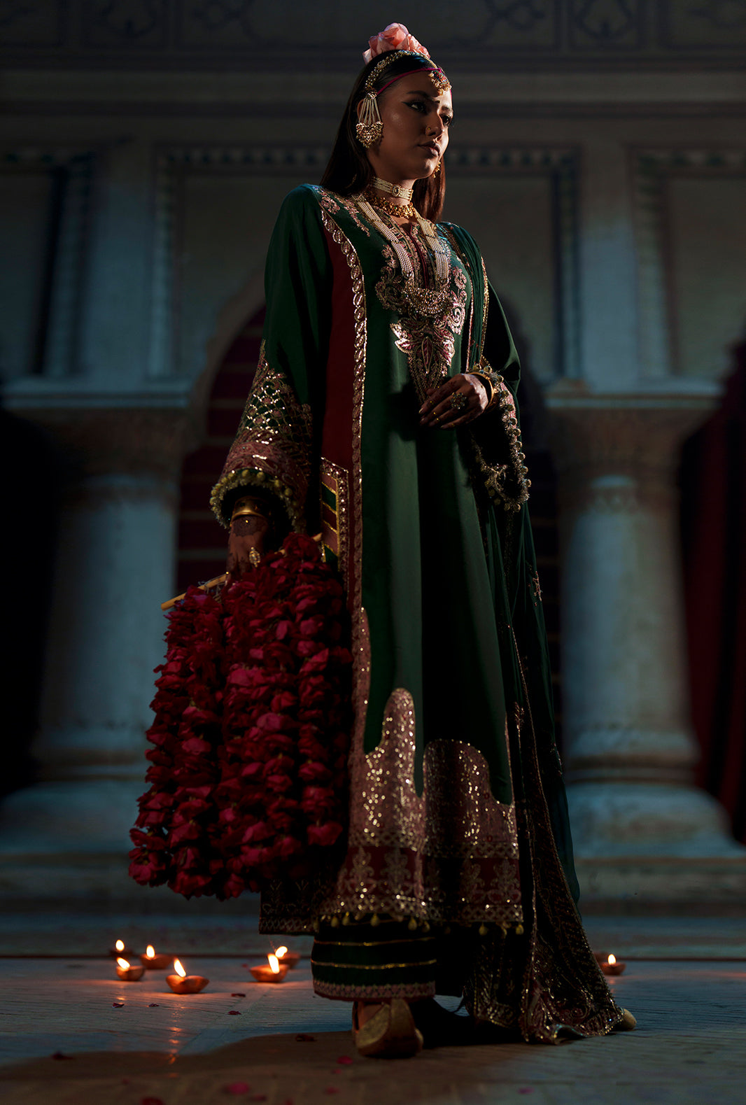 Embroidered neckline, layered borders, and contrasting side panels in deep maroon and pink, paired with a dyed trouser and chiffon dupatta adorned with paisley pallu. Every detail tells a story of timeless elegance and flowing grace.