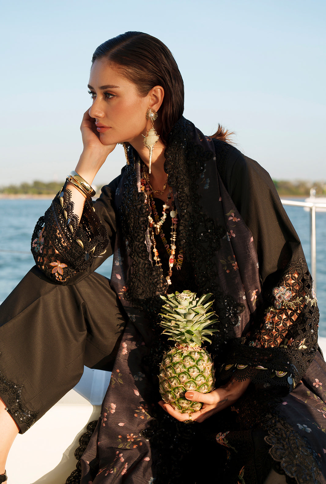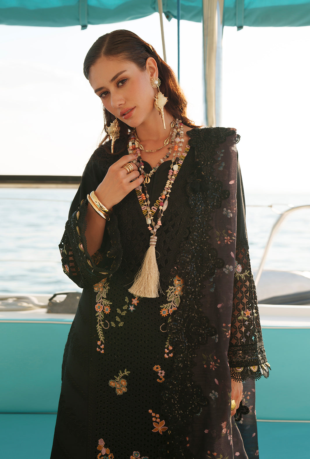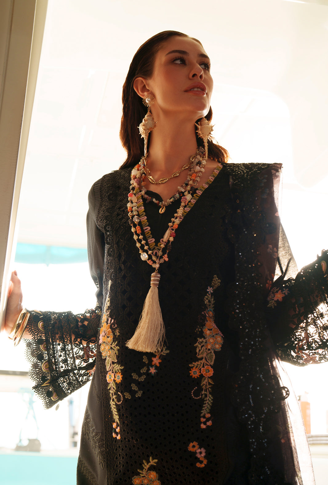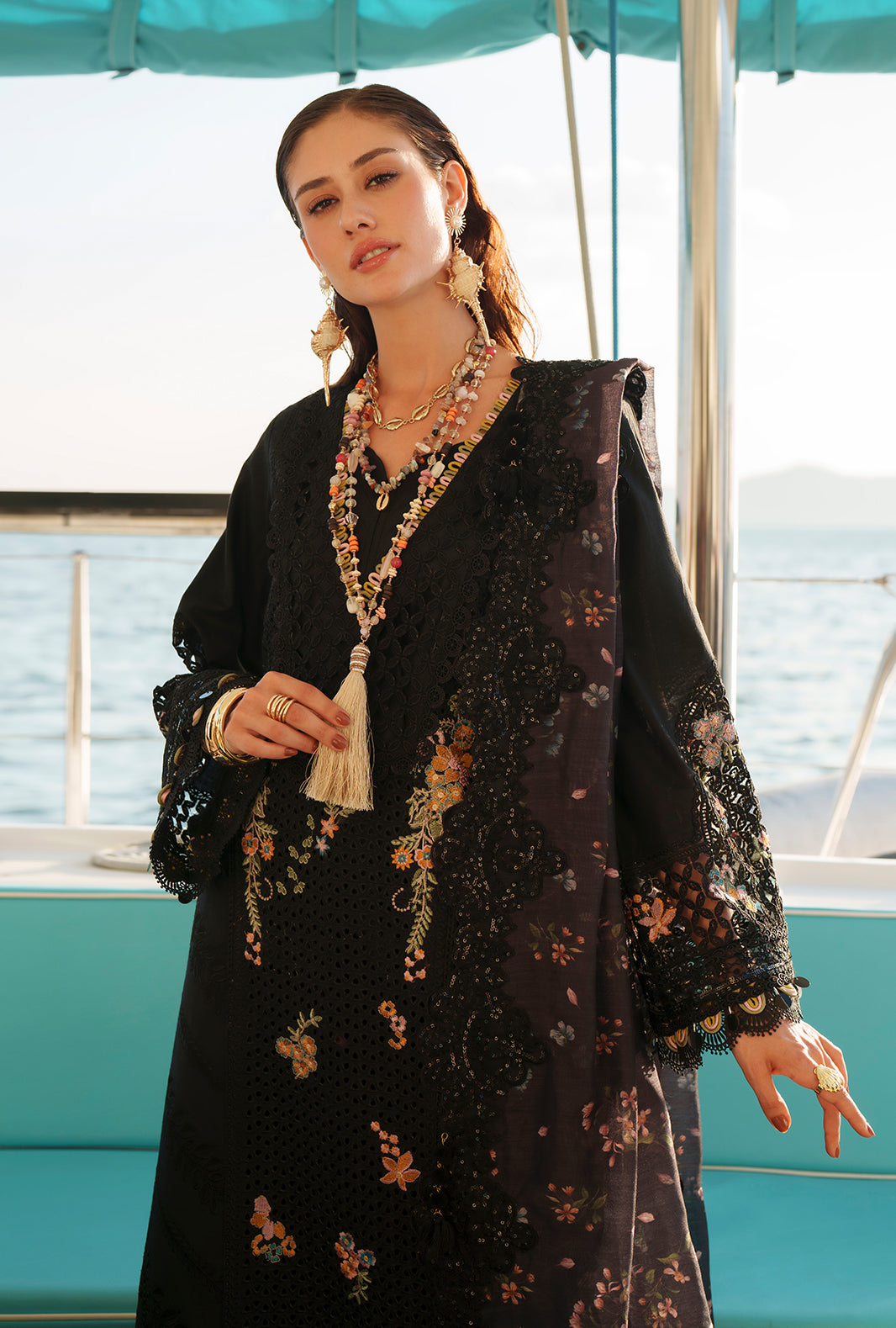 Paired with a printed monark dupatta and cambric trousers accented with organza, this look radiates timeless sophistication.