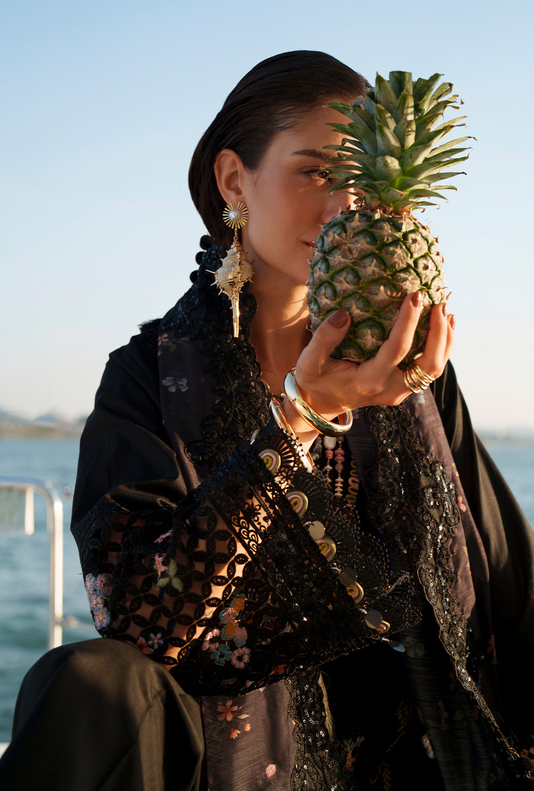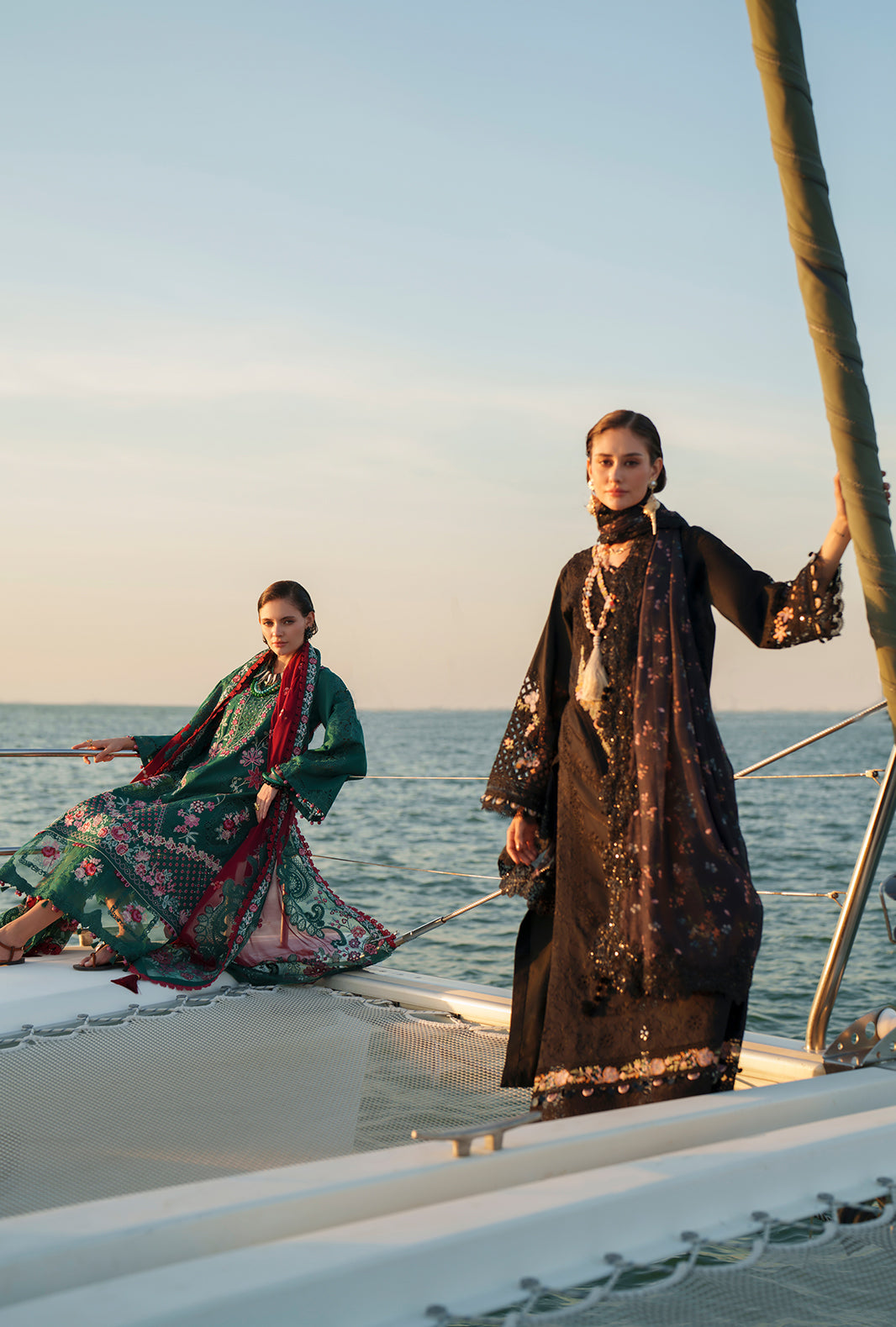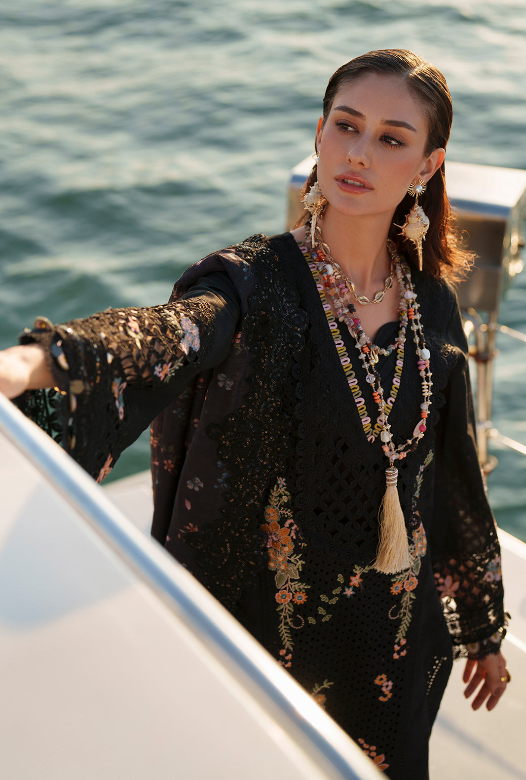 Paired with a printed monark dupatta and cambric trousers accented with organza, this look radiates timeless sophistication.
