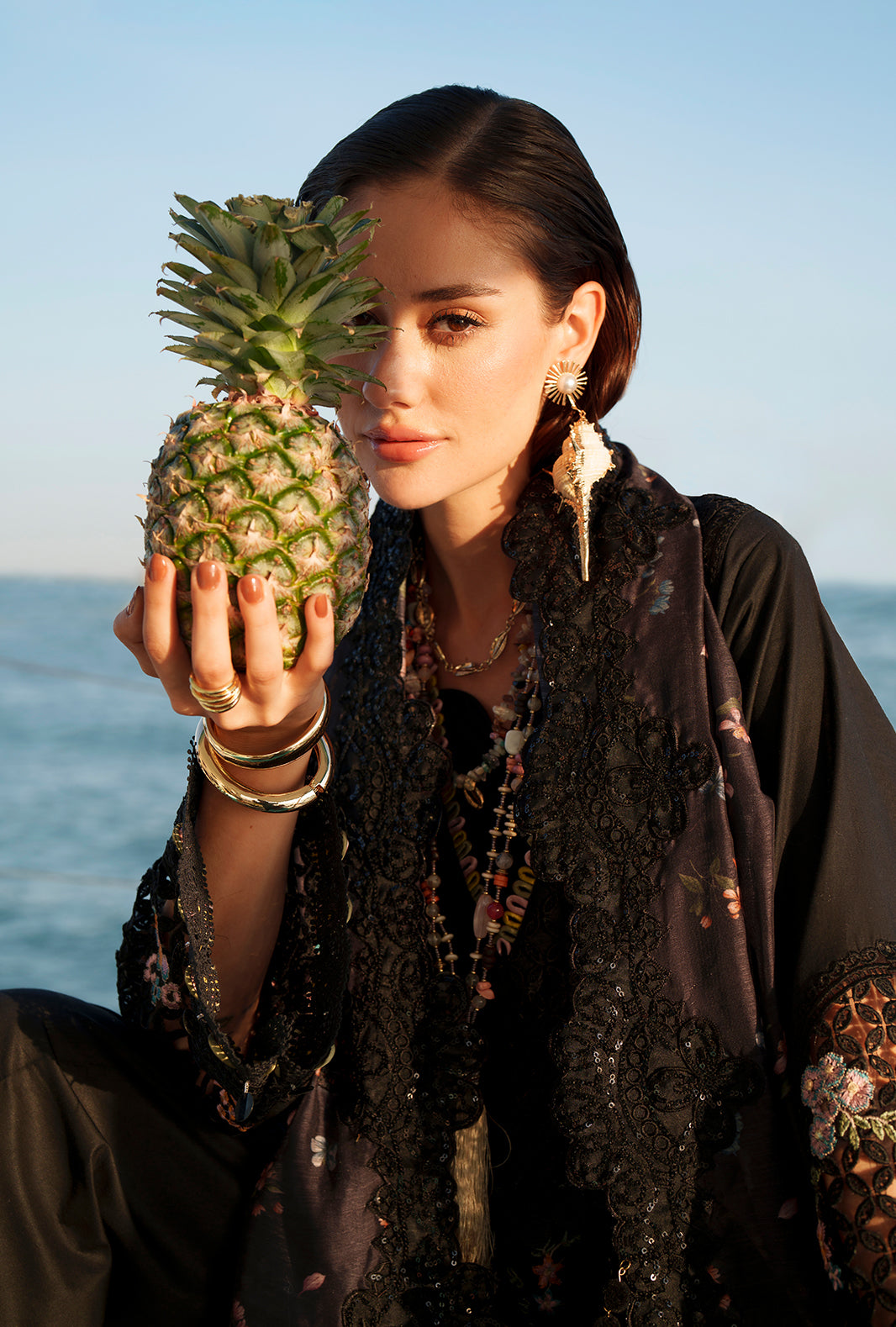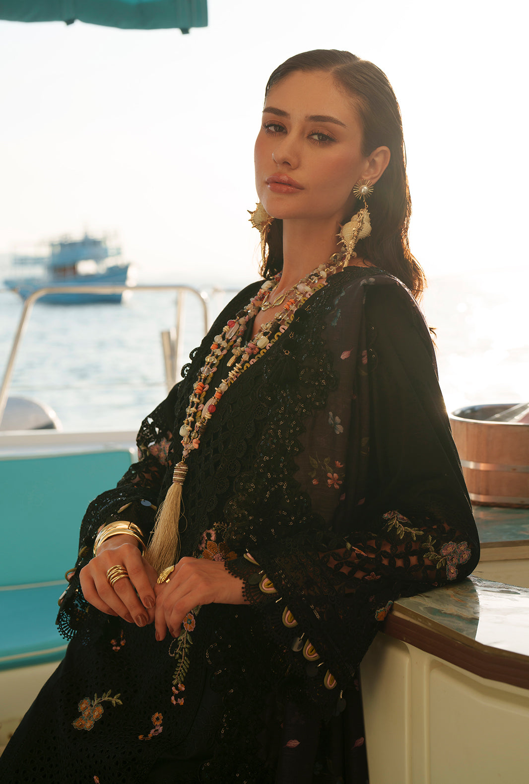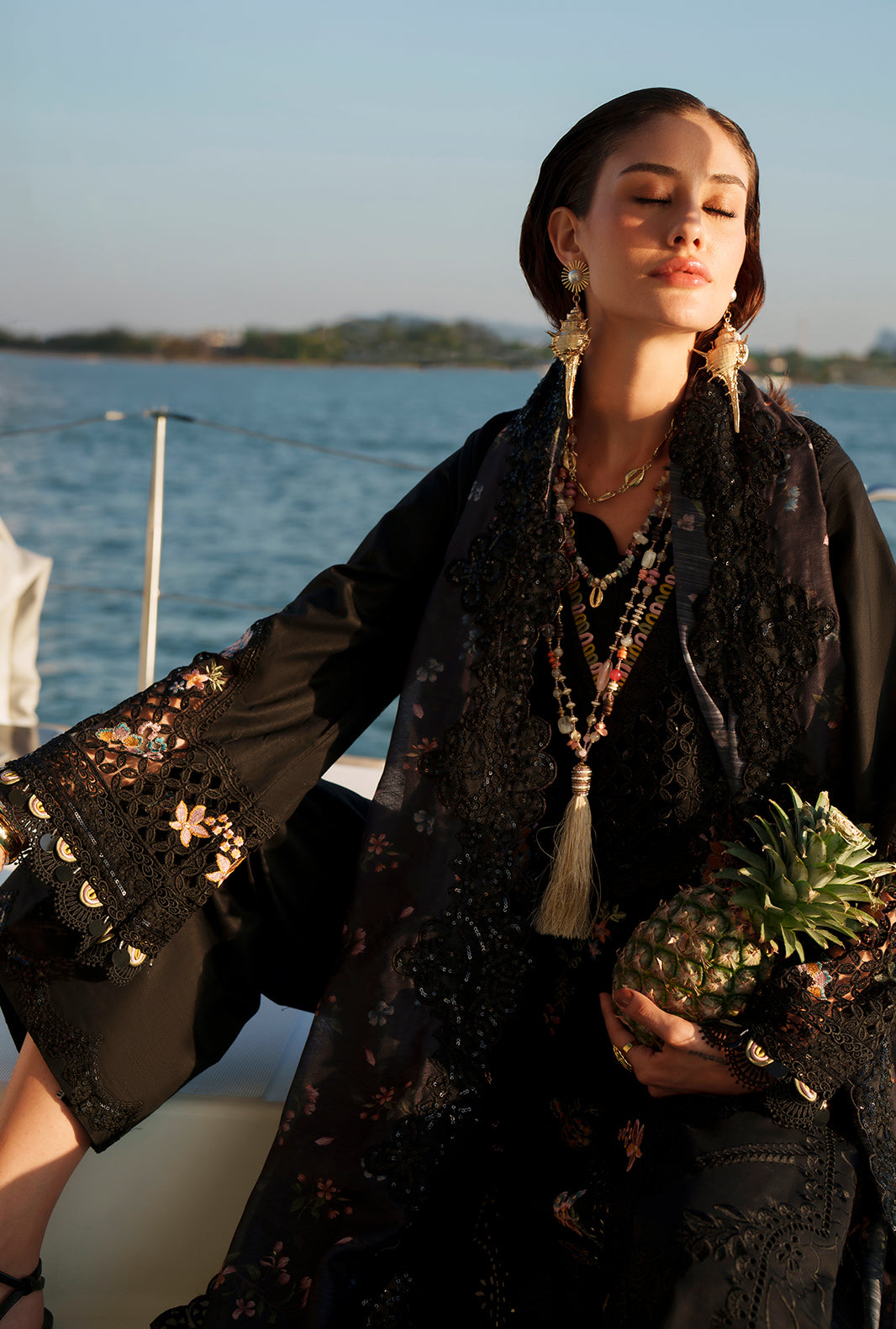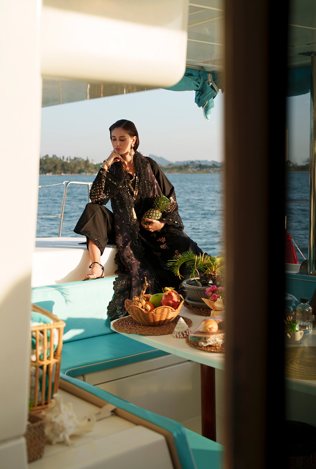 Paired with a printed monark dupatta and cambric trousers accented with organza, this look radiates timeless sophistication.