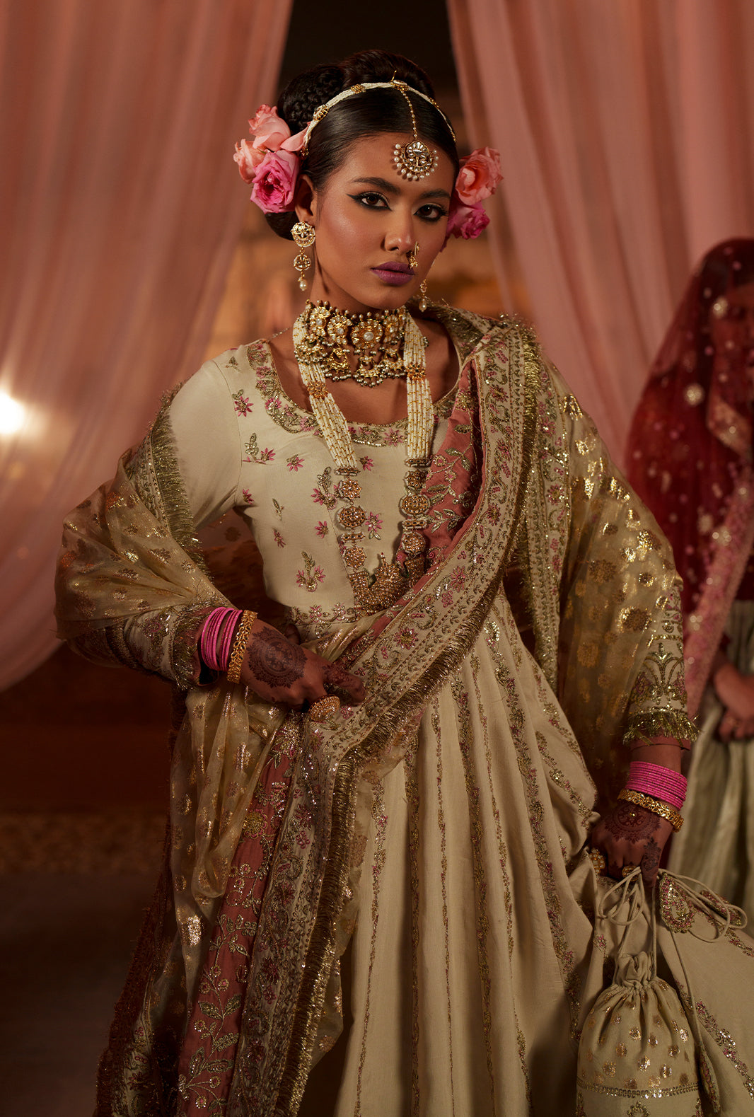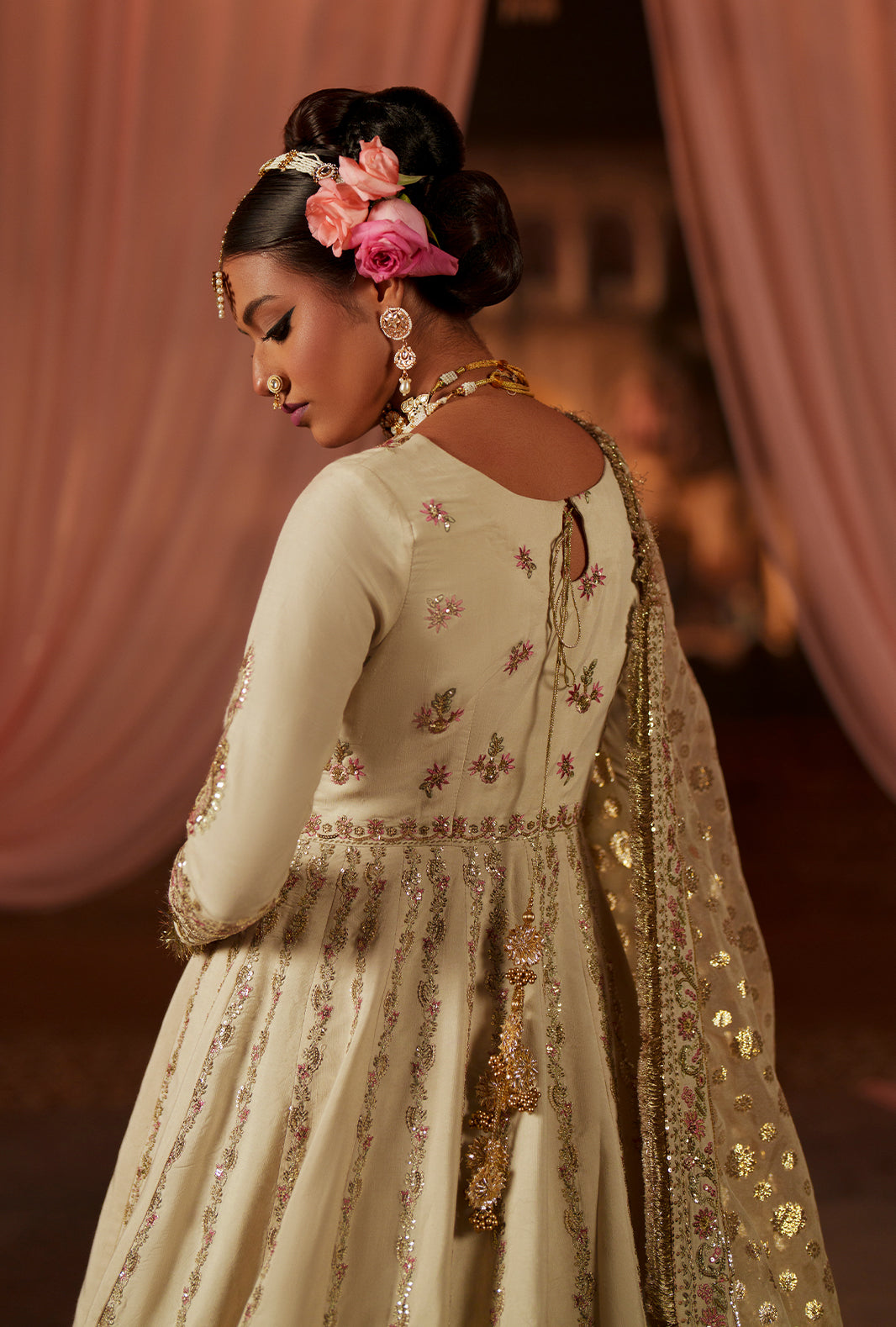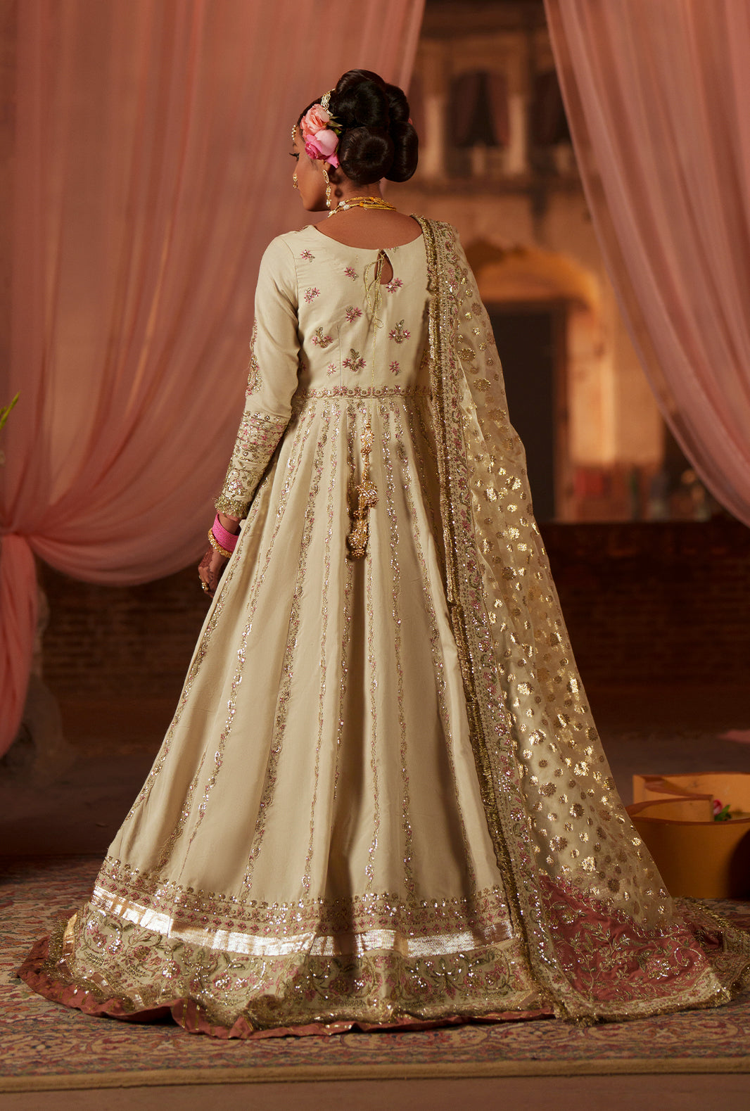 An off-white rawsilk kalidar pishwas adorned with embroidered front and back yokes in tilla, sequins, and resham threads in teapink and mint. Twelve intricately embroidered panels bring depth to the front and back, finished with ornate flare borders. A zari organza dupatta, with a teapink embroidered pallu and off-white silk-bordered edges, completes a look that resonates with celebration, elegance, and timeless craftsmanship.