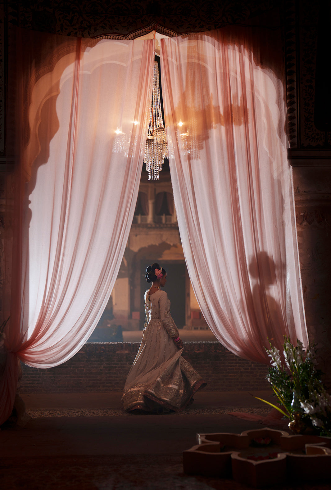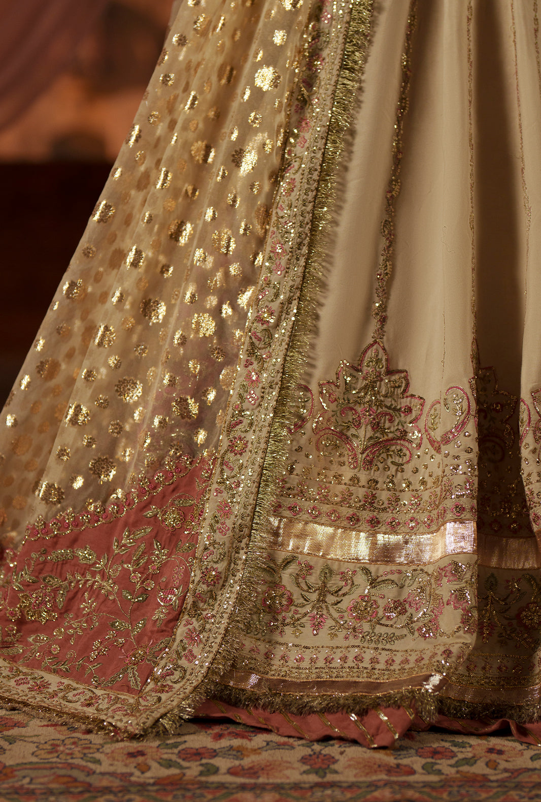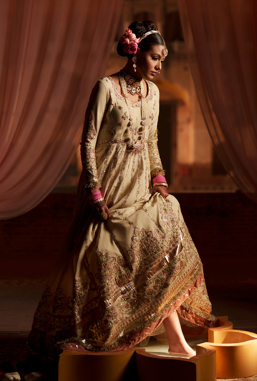 An off-white rawsilk kalidar pishwas adorned with embroidered front and back yokes in tilla, sequins, and resham threads in teapink and mint. Twelve intricately embroidered panels bring depth to the front and back, finished with ornate flare borders. A zari organza dupatta, with a teapink embroidered pallu and off-white silk-bordered edges, completes a look that resonates with celebration, elegance, and timeless craftsmanship.