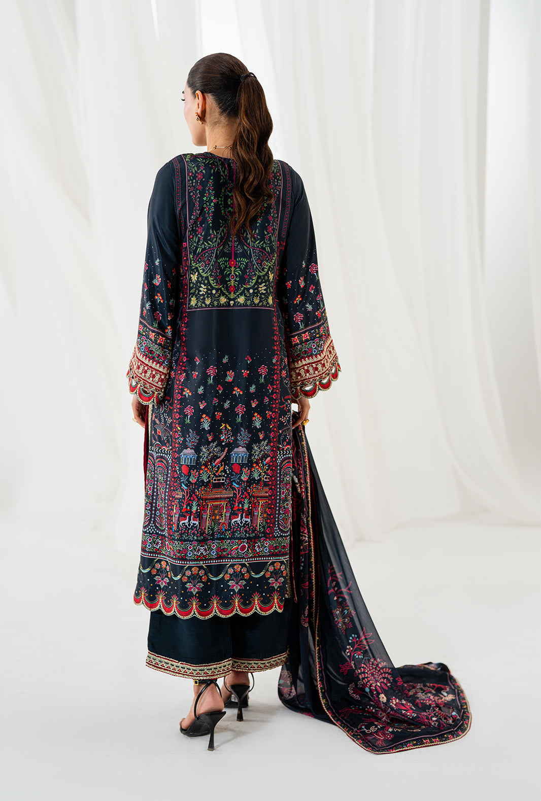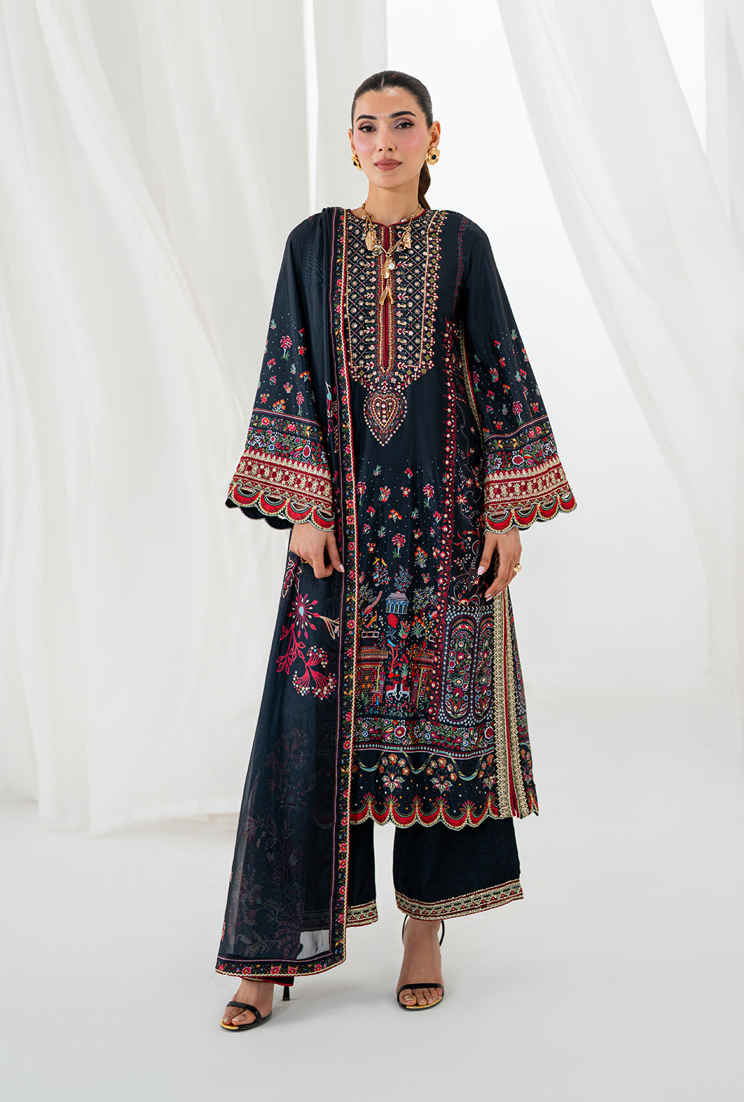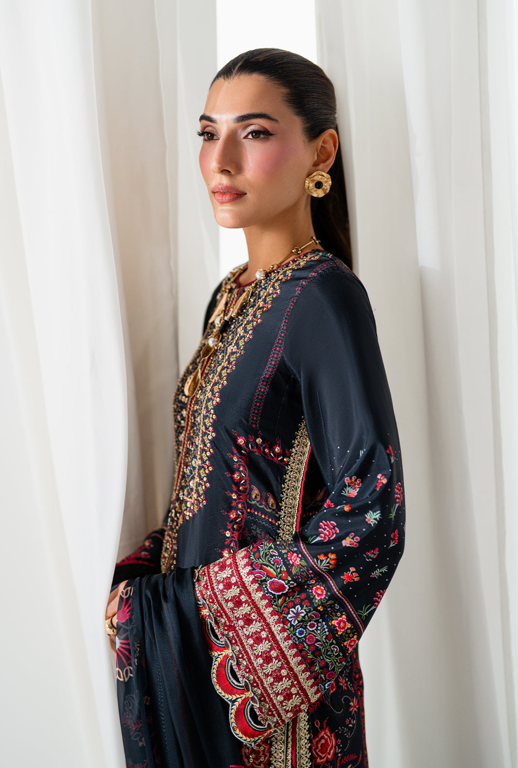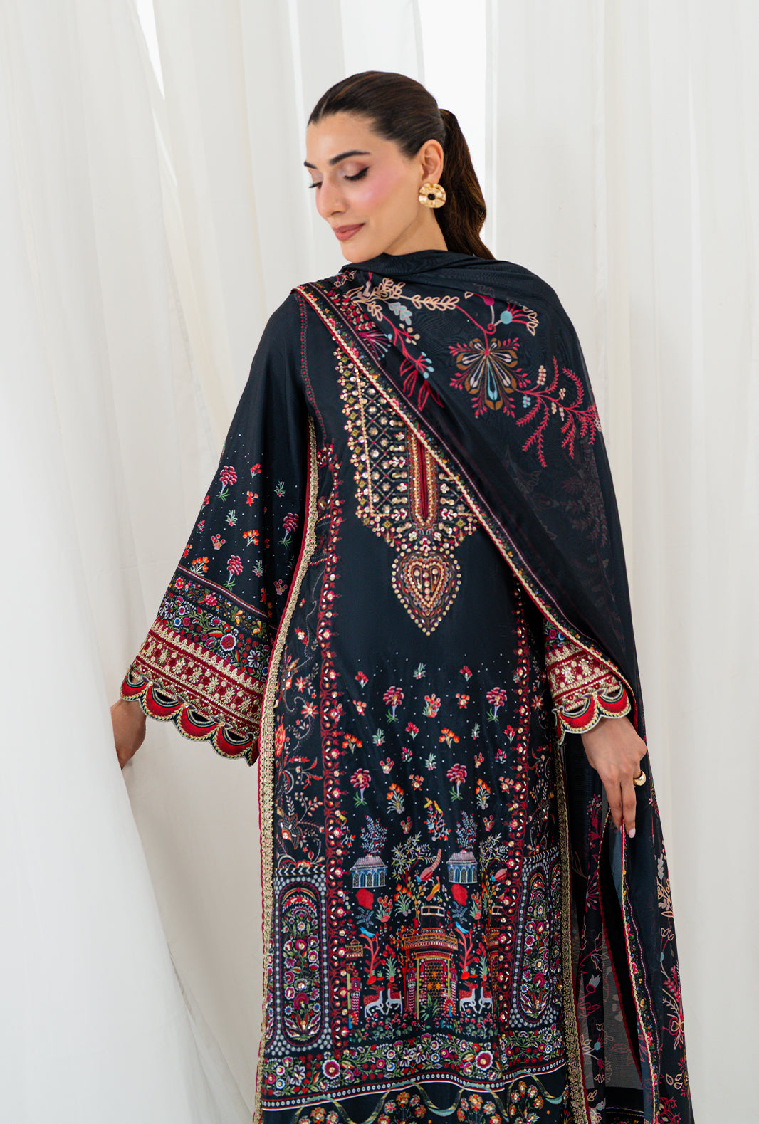 WREN is AJR's boldest opening statement — a deep black printed crepe silk shirt where hand embellishments command every inch of the front with deliberate drama. Sequin embroidered finishing trace the shirt sides while a rich maroon satin silk border frames the sleeves, creating a contrast that is as considered as it is striking. Dyed raw silk trousers with a clean embroidered border anchor the silhouette with quiet authority. A printed silk dupatta completes the look — dark, refined and unmistakably AJR.